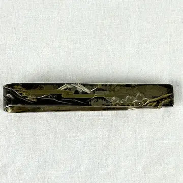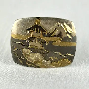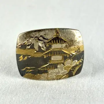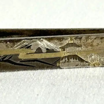 Add a touch of sophistication to your ensemble with our Vintage Japanese Oxidized Silver Cufflinks and Tie Clip. Handcrafted from sterling silver, each cufflink features an etched landscape scene, depicting a serene temple with Mt. Fuji in the background. Perfect for special occasions, these elegant accessories exude luxury and exclusivity.