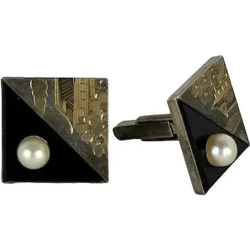 Mid Century Japanese Black Onyx Silver and Pearl Square Cufflinks
