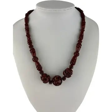 Vintage Carved Chinese Red Lacquer Shou Bead Necklace