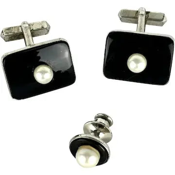 Vintage Japanese Black Onyx and Pearl Cufflinks and Tie Pin