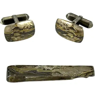 Vintage Japanese Oxidized Silver Cufflinks and Tie Clip with Etched Landscape Scene