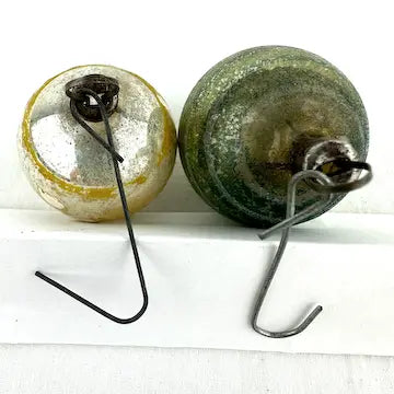 The ornaments each have wear to the surface commensurate with age. 2 of the pink ones and the blue one have a delicate powdery finish. Three have chips underneath the caps. There are no other cracks or breaks.