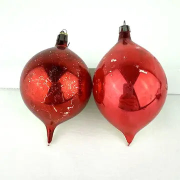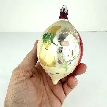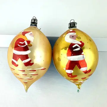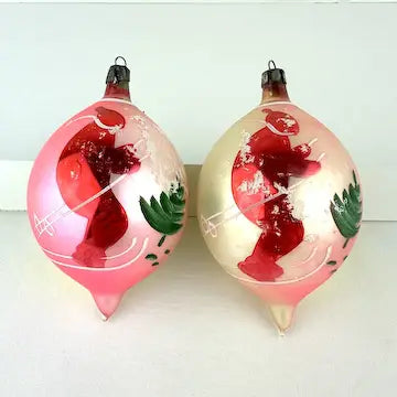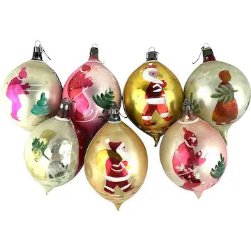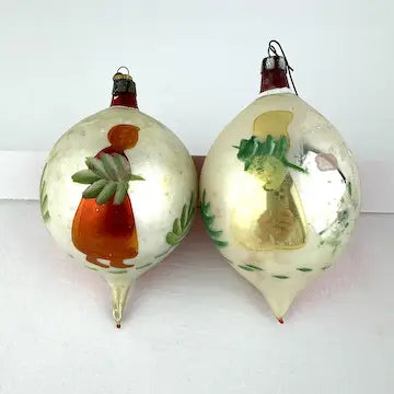 There is some wear to the painted surface commensurate with age. One of the ornaments with the image of the girl and trees has a fair amount missing on one side. The glass bulbs themselves are in great condition with no chips cracks or breaks.