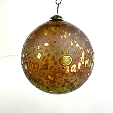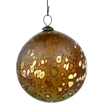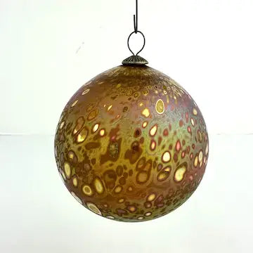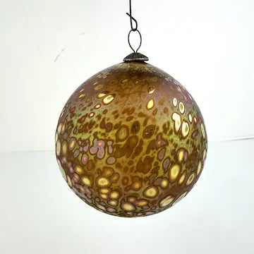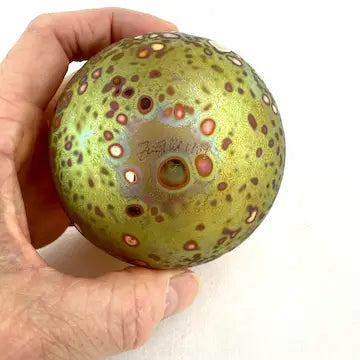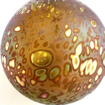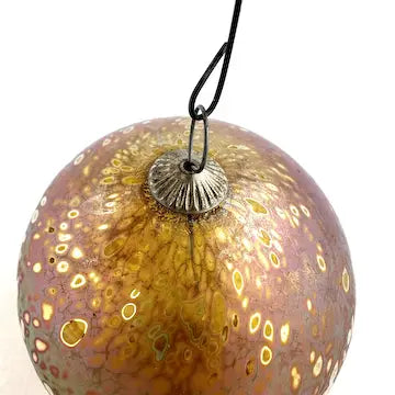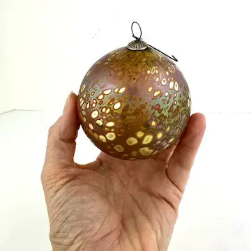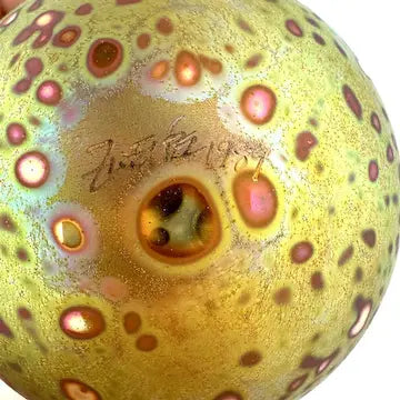 This Craig Zweifel art glass Christmas ornament features a round bulb shape with a beautiful gold iridized finish. Crafted with expert technique, this one-of-a-kind ornament will add a touch of elegance to your holiday decor. Bring home a piece of art and celebrate the season in style.