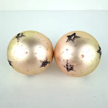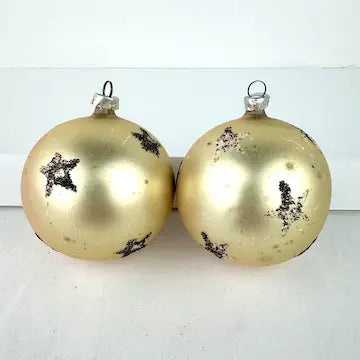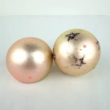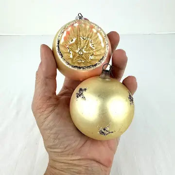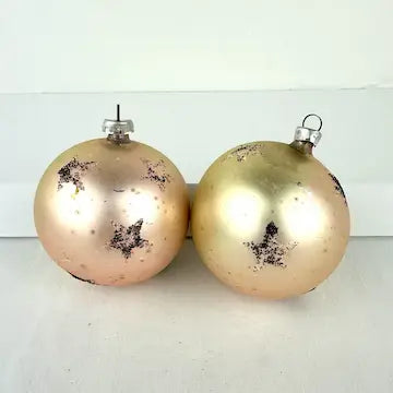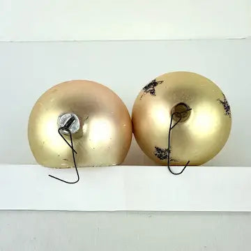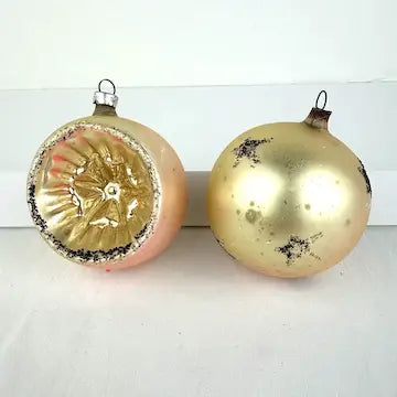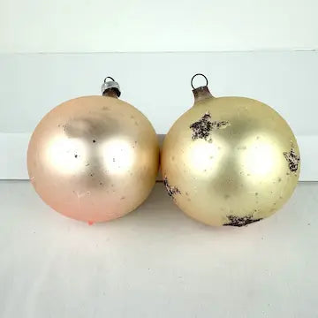 One of the ornaments does not have a cap. There is age related wear to the surface of the ornaments but overall they are in great vintage condition.