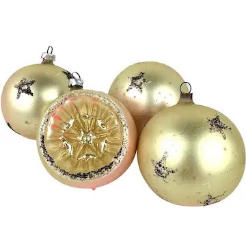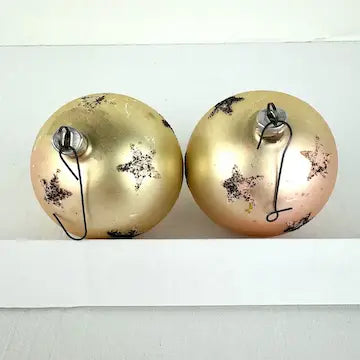 Elevate your holiday decor with this set of 4 vintage midcentury glass ornaments from West Germany. Adorned with delicate mica stars, each one a unique color transition from gold to pink. These ornaments add an elegant touch to any tree with their timeless design.