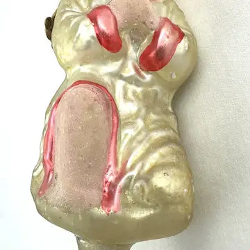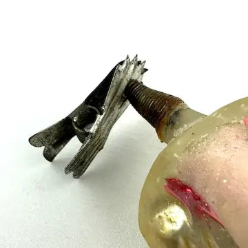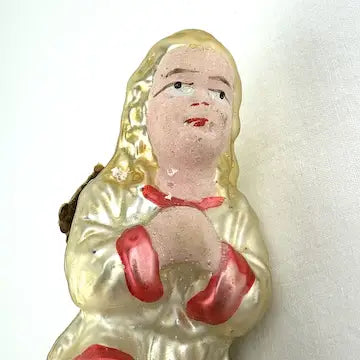 Indulge in the luxury of our rare antique German glass angel clip ornament. Hand blown and hand painted, this Victorian-style treasure boasts intricate details and golden hair. The rare cream and pink colors add a touch of sophistication to your holiday decor. Bring elegance and artistry into your home with this antique angel, gracefully praying on your Christmas tree.