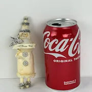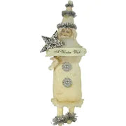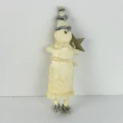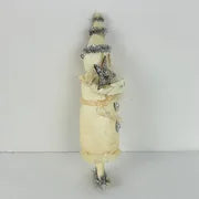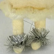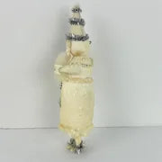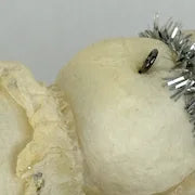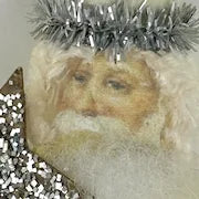 Indulge in the elegance of our Vintage Spun Cotton German Christmas Ornament. This hand-crafted ornament features a glistening Santa Claus holding a banner and star, embellished with glitter, tinsel, and a die cut lithograph face. With its sophisticated design and German influence, it's the perfect addition to your white and silver holiday decor.