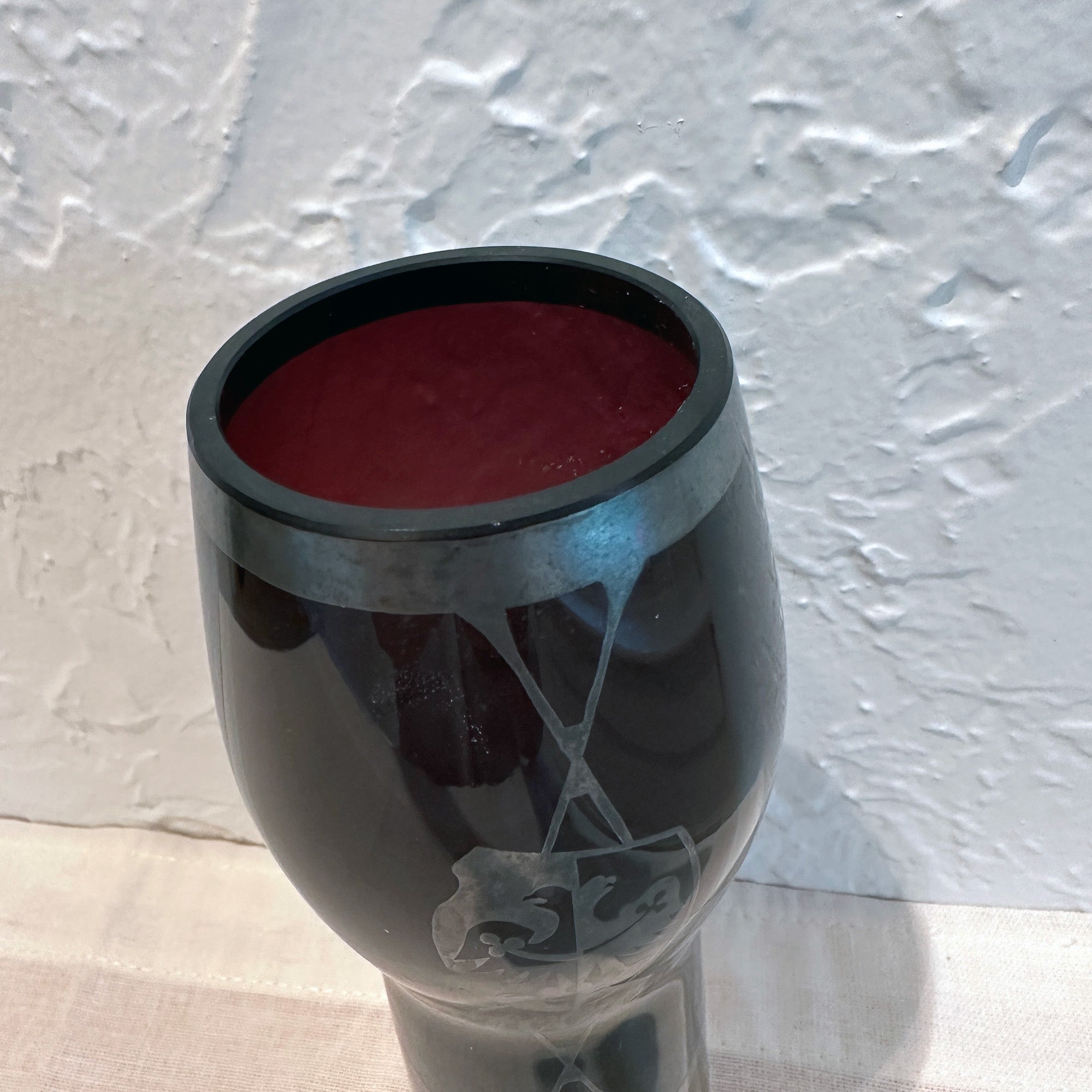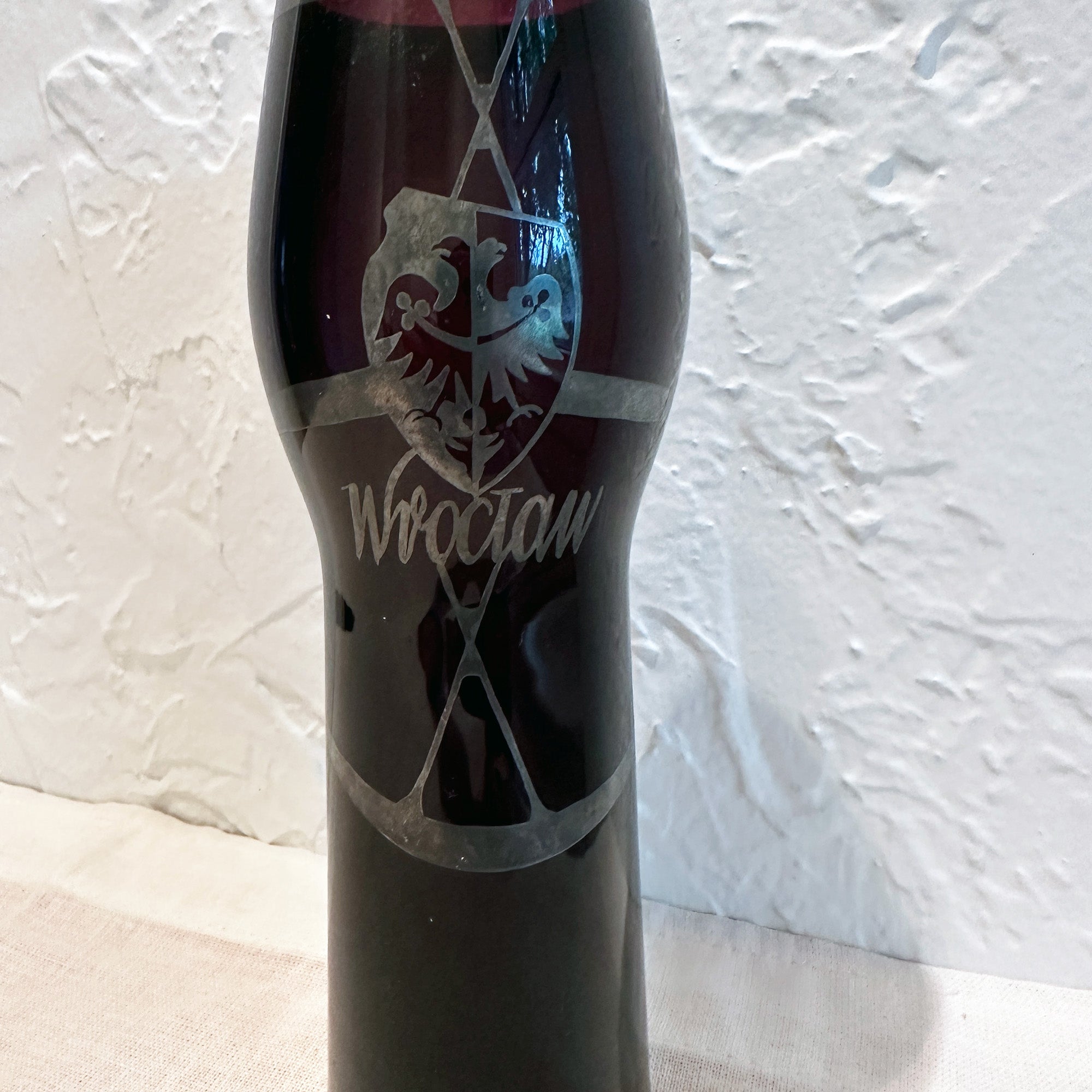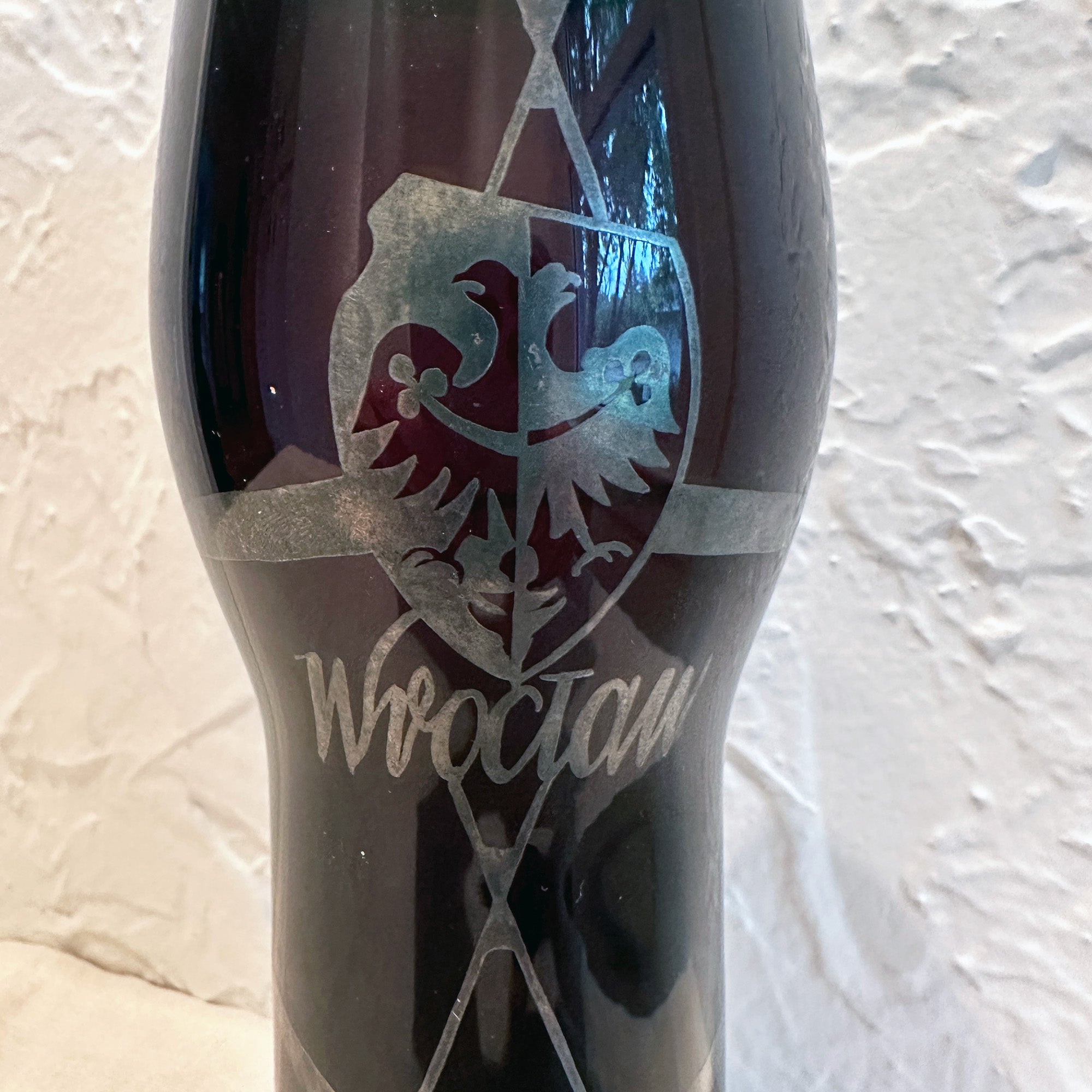 This vintage amethyst colored glass vase with silver overlay is in the jugendstil style. It depicts a coat of arms for Wrocław Poland.
