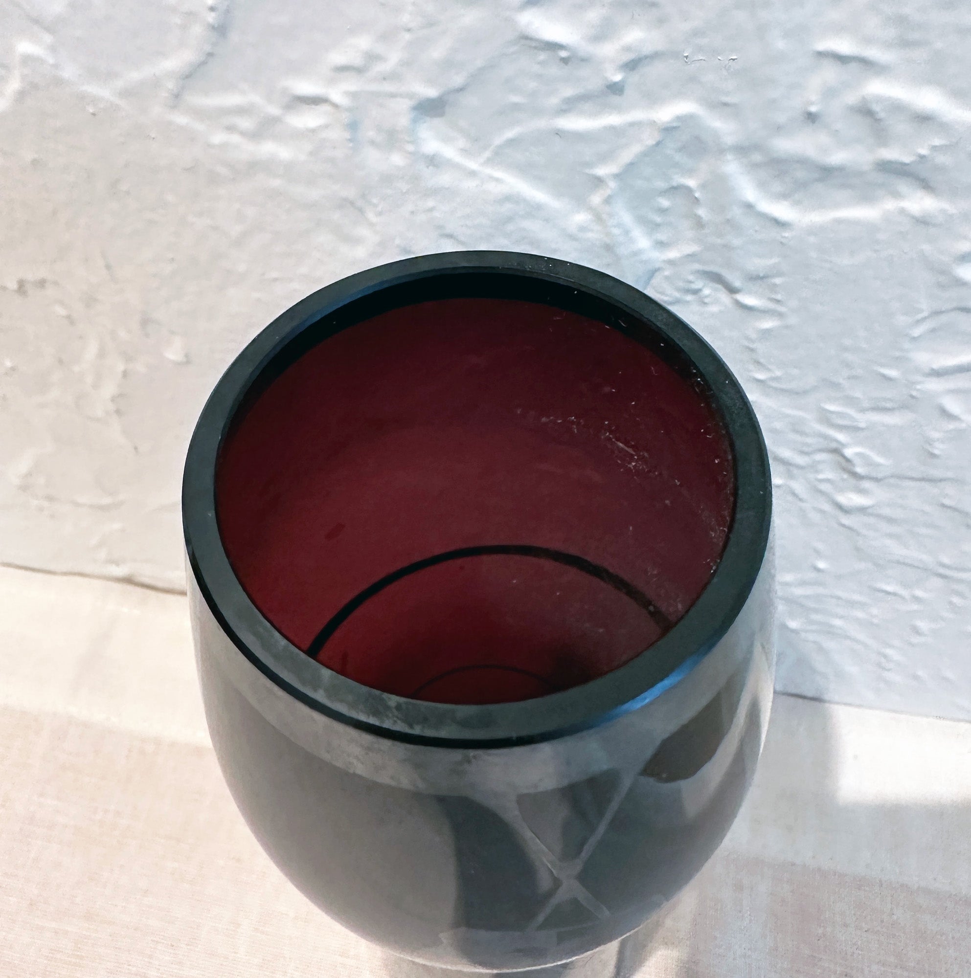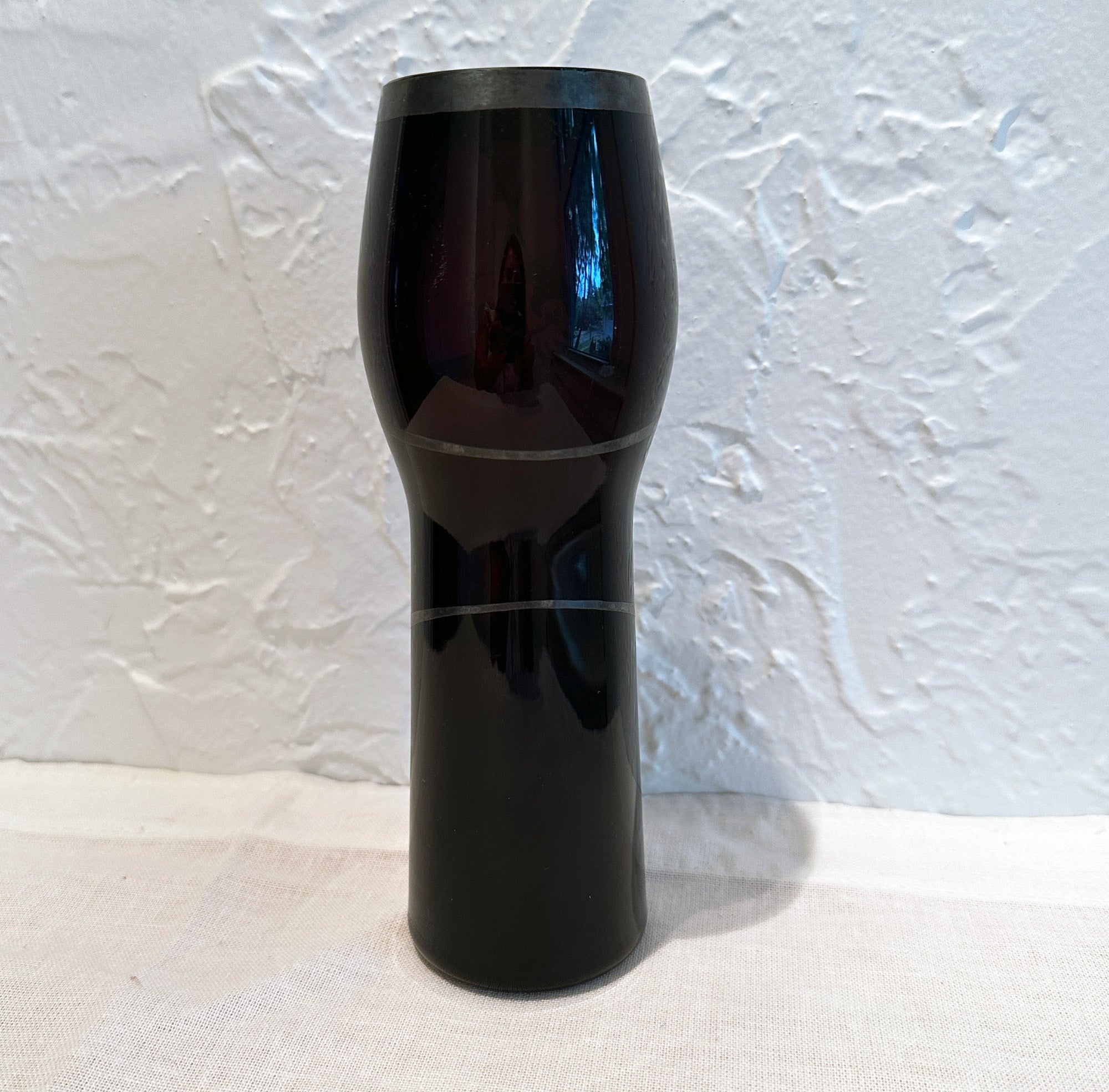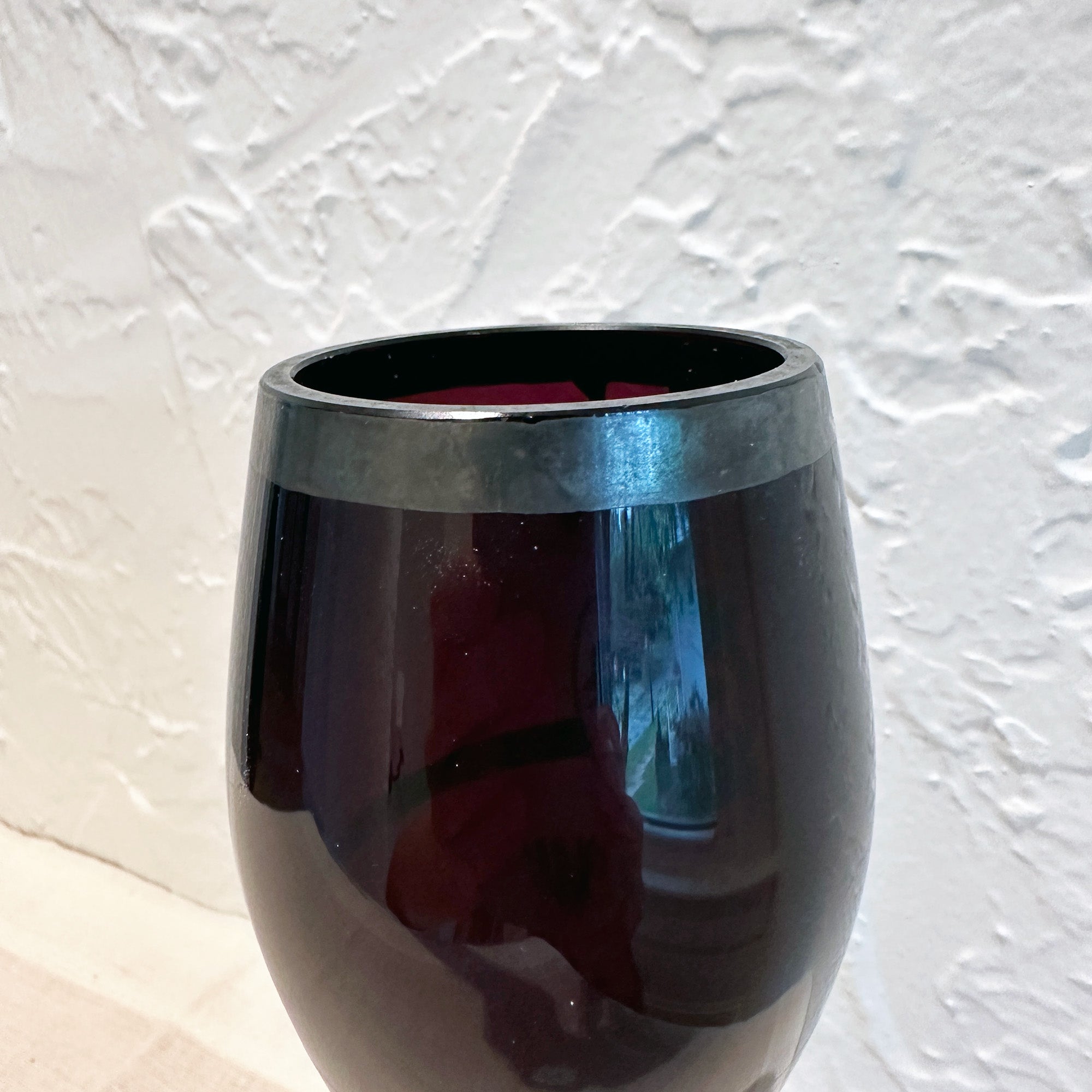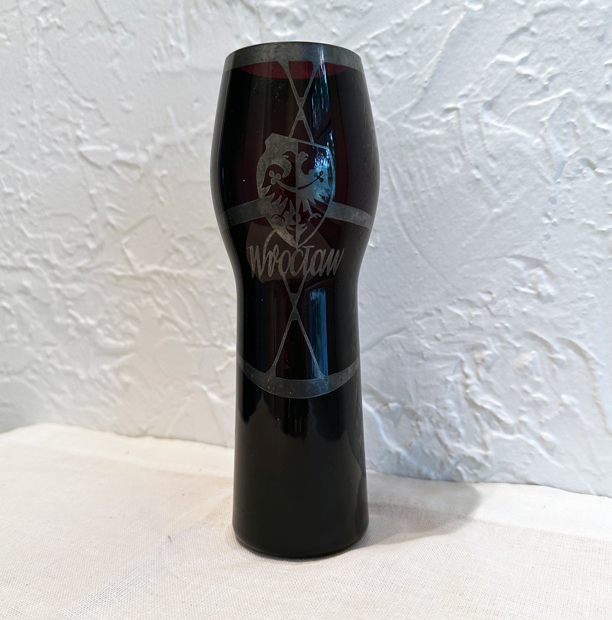 This vintage amethyst colored glass vase with silver overlay is in the jugendstil style. It depicts a coat of arms for Wrocław Poland.
