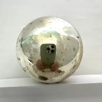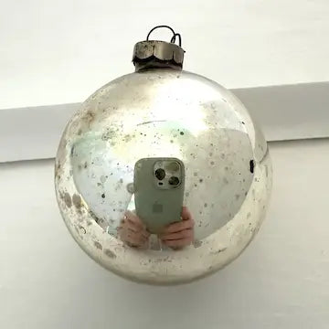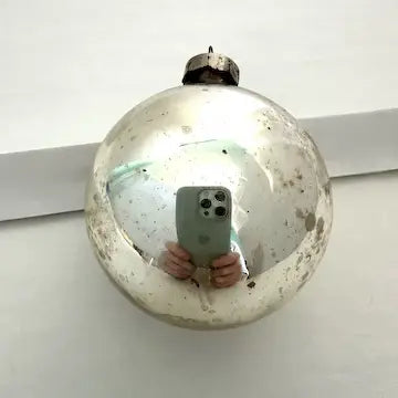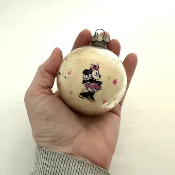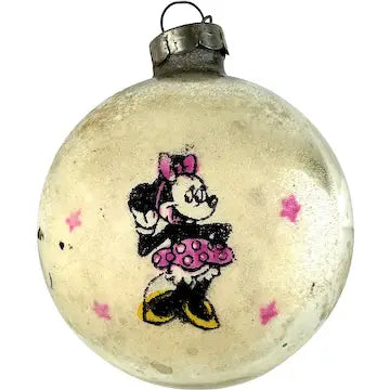 This vintage mid century Disney Minnie Mouse ornament adds a touch of nostalgia and charm to your Christmas tree. Made of rare mercury glass, it is a highly collectible decoration that will delight Disney fans. With its round silver design, it is the perfect addition to any holiday display.