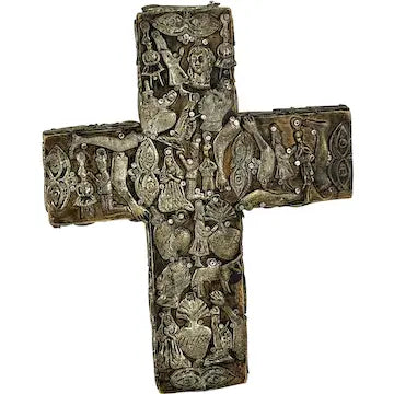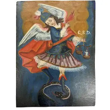 Vintage Cuzco Painting of Angel Holding a Scale and Stepping on a Serpent