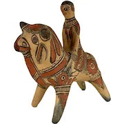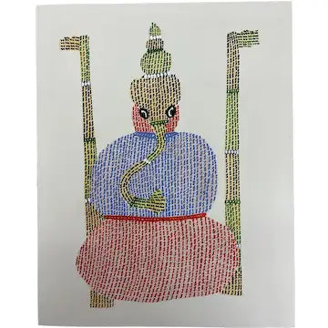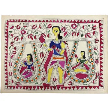 Vintage Mudhubani Folk Art Painting of Woman Carrying Two Seated Women