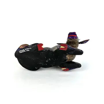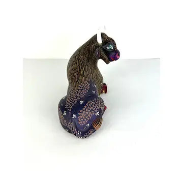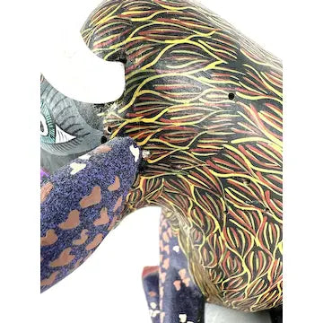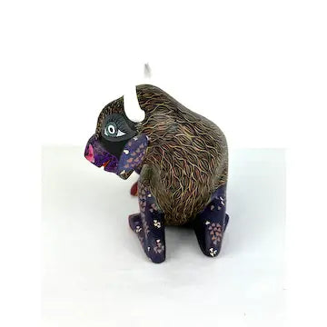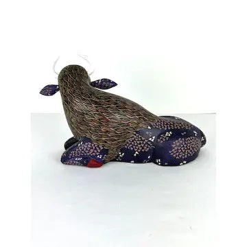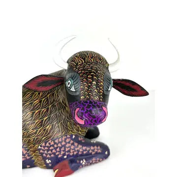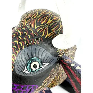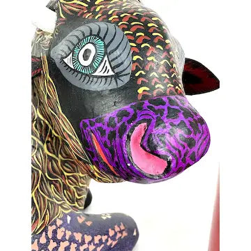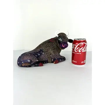 Indulge in the beauty of Eleazar Morales' Mexican folk art Alebrijes bull. Each vintage piece is handcrafted with love, a true Oaxacan masterpiece. Made of painted wood, this bull figurine exudes elegance and sophistication, perfect for art and culture enthusiasts. Enhance your collection with this exclusive and unique piece.