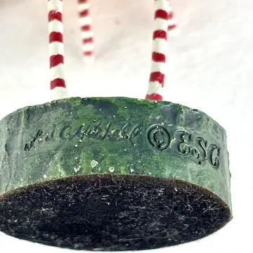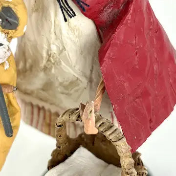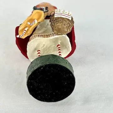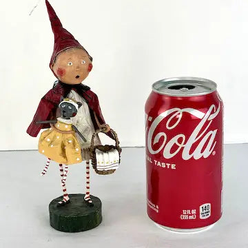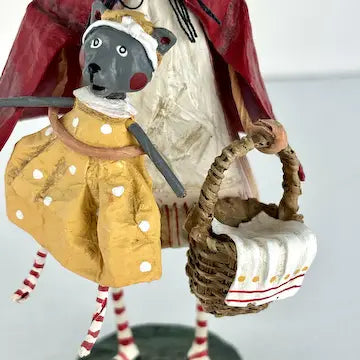 This signed Lori Mitchell ESC figurine is a whimsical and collectible piece of folk art. Made from paper mache, wire, and a resin base, the figurine depicts Little Red Riding Hood carrying a basket and a wolf doll. Add a touch of charm to your home with this unique creation.
