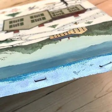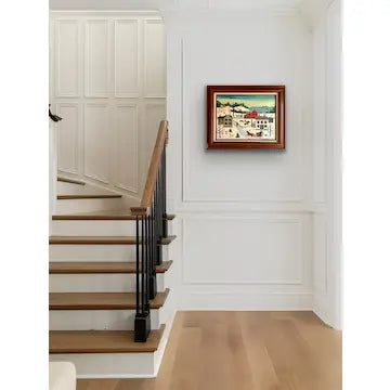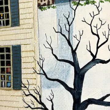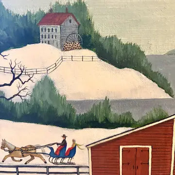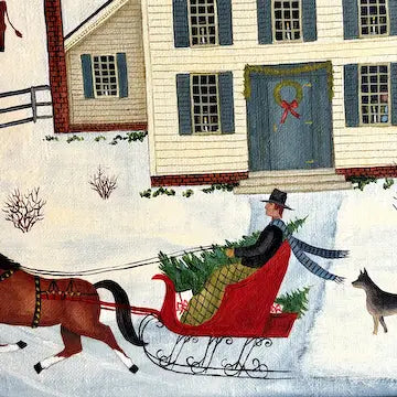 This original Folk Art Christmas oil painting by Linda Nelson Stocks captures the charm of a vintage New England farm during the holiday season. Known for her work featured in Lang calendars, Stocks showcases a winter wonderland with a man bringing home gifts in a horse-drawn sleigh, homes adorned with festive decor, and a farmer tending to his cows while kids sled in the background. A timeless addition to any art collection.