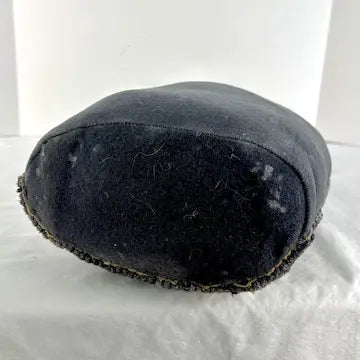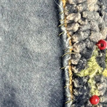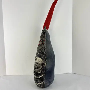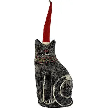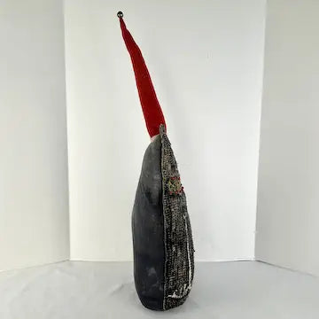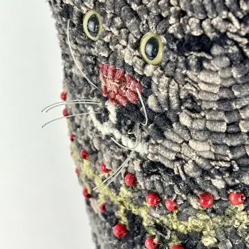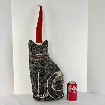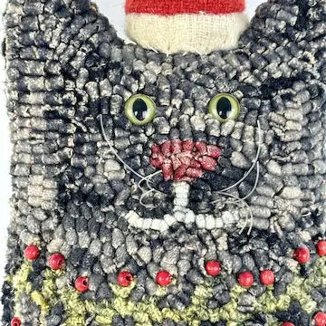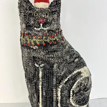 This hand made Christmas Cat features a primitive style and is crafted using the traditional rug hook technique. Its whimsical design, complete with a festive hat and collar, adds a touch of charm to any space. Made with gray stuffed animal fabric and signed by the artist, this freestanding piece is a unique addition to your holiday decor.