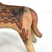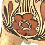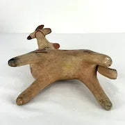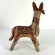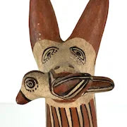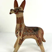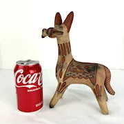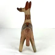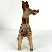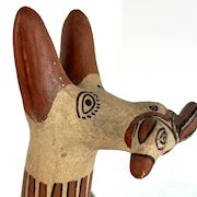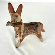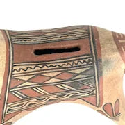 Expertly crafted in Guerrero, Mexico, this vintage bank showcases traditional indigenous style through its hand-fired terra cotta construction and vibrant polychrome geometric design. The charming depiction of a dog with a bird in its mouth adds a playful touch to this unique piece, making it a perfect addition to any folk art collection.