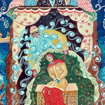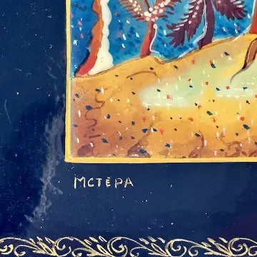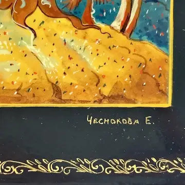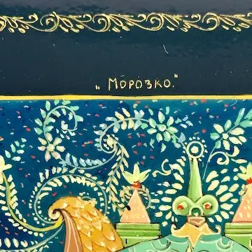 This vintage Mstera Russian fairy tale lacquer box features a hand-painted fairy tale scene by artist Chesnokova E in the traditional Mstera style. This beautiful lacquer jewelry box showcases the beloved Russian character Father Frost Morozko, rescuing a woman who has been banished to the woods by her unloving mother, making it a unique and culturally rich addition to any collection.