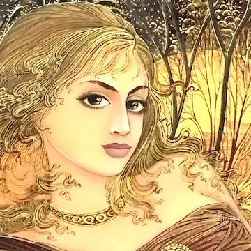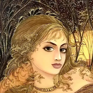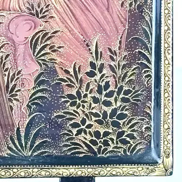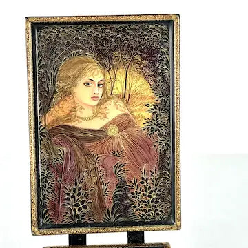Experience the beauty of traditional Russian art with our vintage Russian Kholui lacquer miniature portrait easel. This elegant miniature easel features a stunning lacquer painting of a beautiful woman surrounded by intricate trees and foliage, expertly crafted with the Kholui technique on durable paper mache. Add a touch of history and culture to your home decor with this vintage masterpiece.