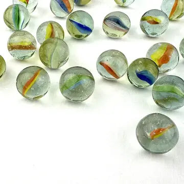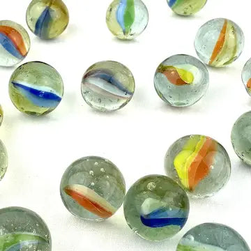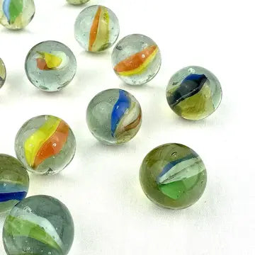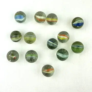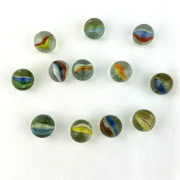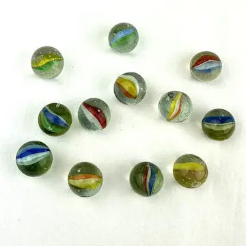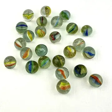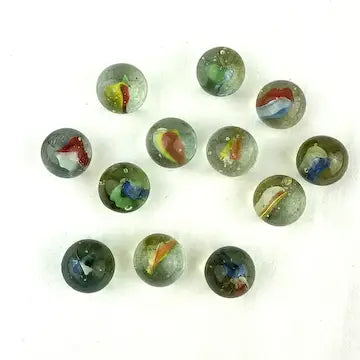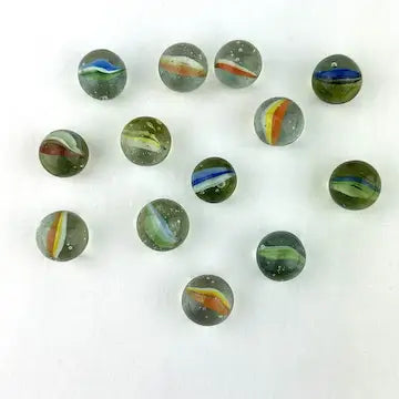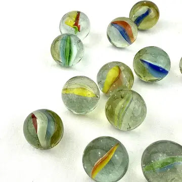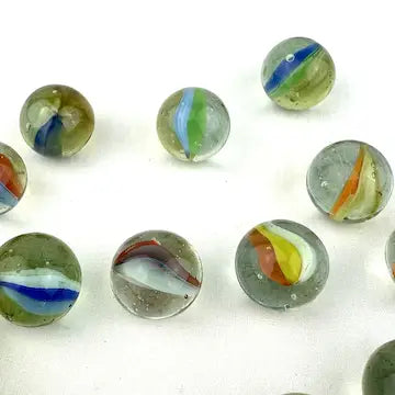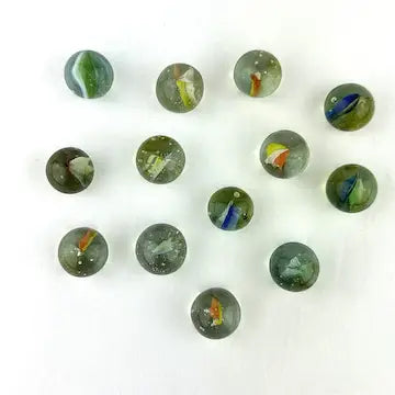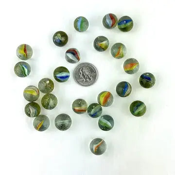Enhance your marble collection with this luxurious set of 25 midcentury 4 & 6 vein Japanese cat eye marbles. These exotic marbles feature vibrant blue, green, orange, red, and yellow colors to add a touch of elegance to your game. Elevate your gameplay with these exclusive marbles.