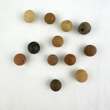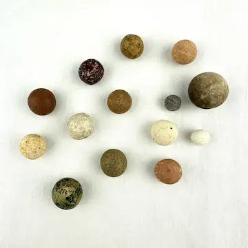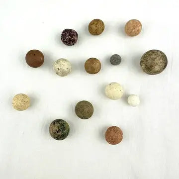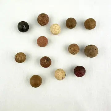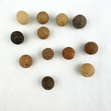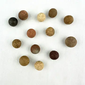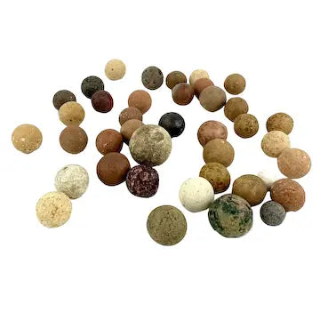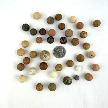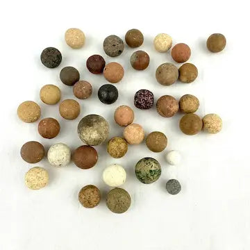 Experience the classic game of marbles with this set of 39 Victorian era clay marbles. Each marble is carefully crafted in beige, cream, and red colors, with various sizes for a varied and challenging gameplay. Perfect for collectors and game enthusiasts alike.