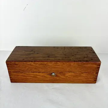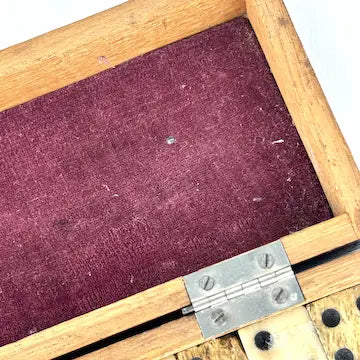 Box is in great condition closure button still tight and there are no cracks in the wood. Dominoes are in good condition. One domino was chipped on the corner at one time