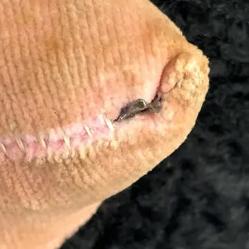 It is in good vintage condition. The mohair is worn but does not have holes in it.  The pink nose is dirty and has a metal piece at the end of it.  It looks like something was broken off the end of the nose or the interior structure is poking through the seam.