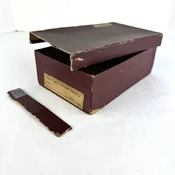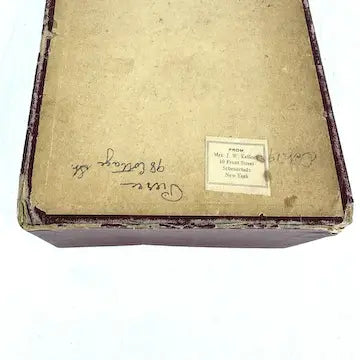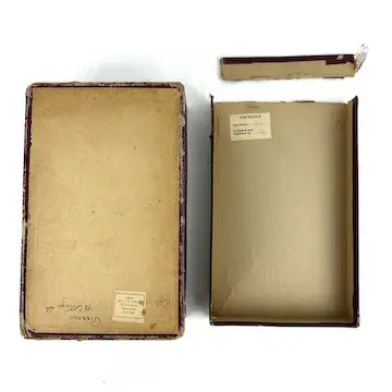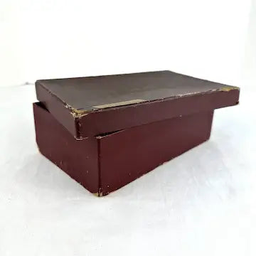 The box is in fair condition. The bottom has some separation at the corners but is intact. The lid also has some separation at the corners and one side has completely come off.