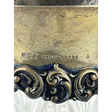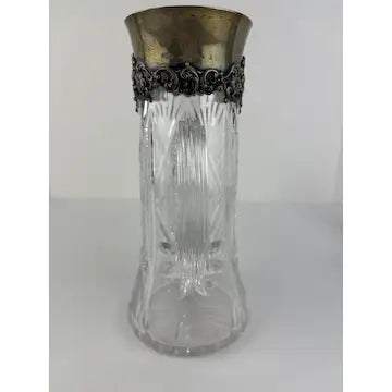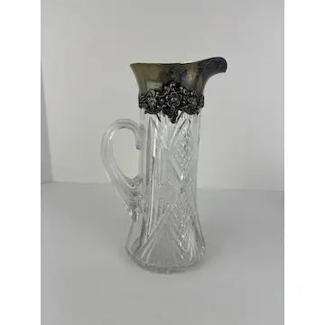 This antique crystal cut silver collared claret pitcher and highball glasses set from the early 1900s is a stunning addition to any collection. Featuring a beautiful floral pattern and diamond patterned glasses, this set is made by the renowned Gorham Silver company in Rhode Island. A timeless and elegant piece.