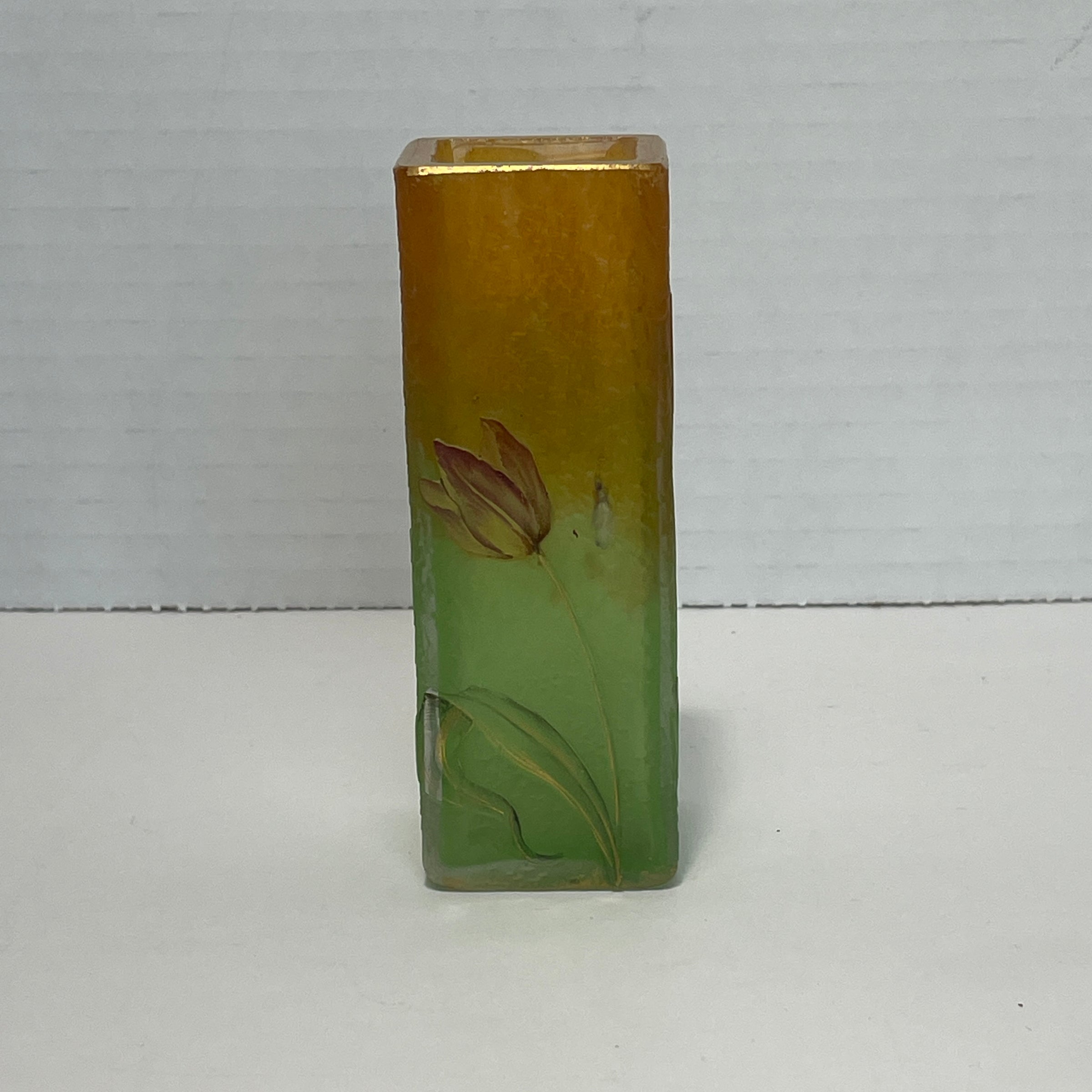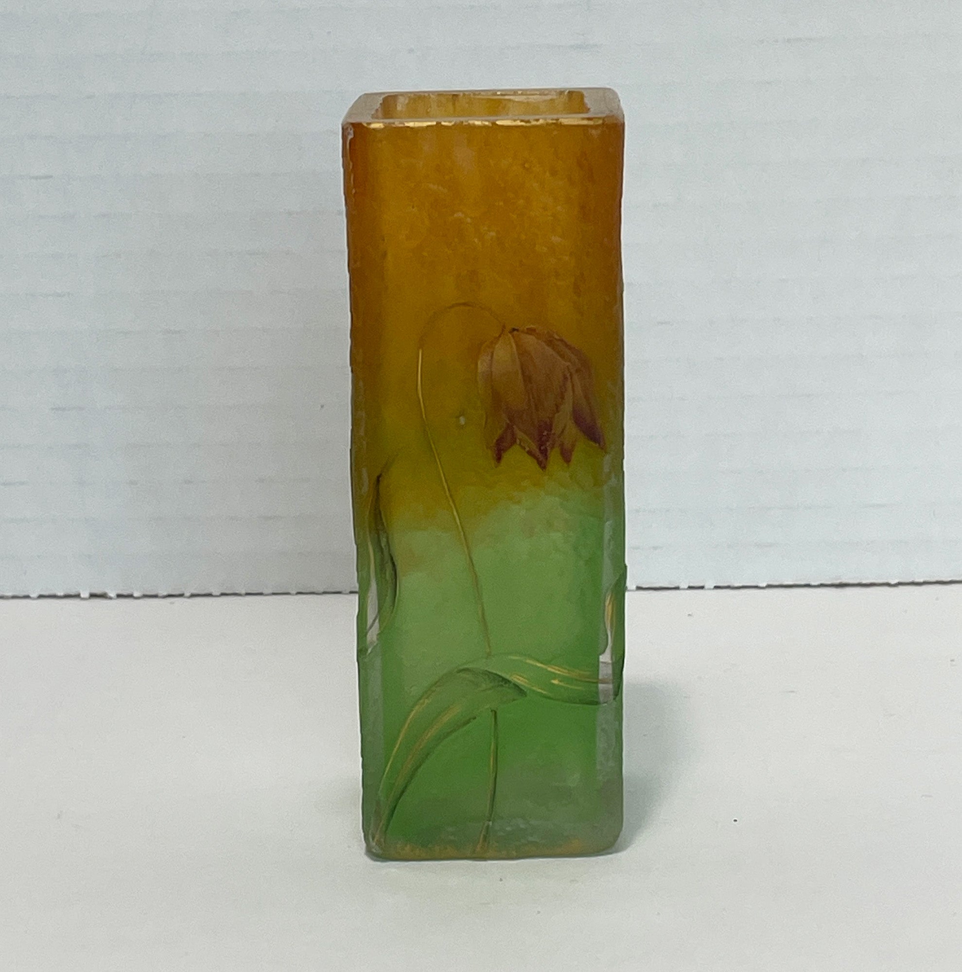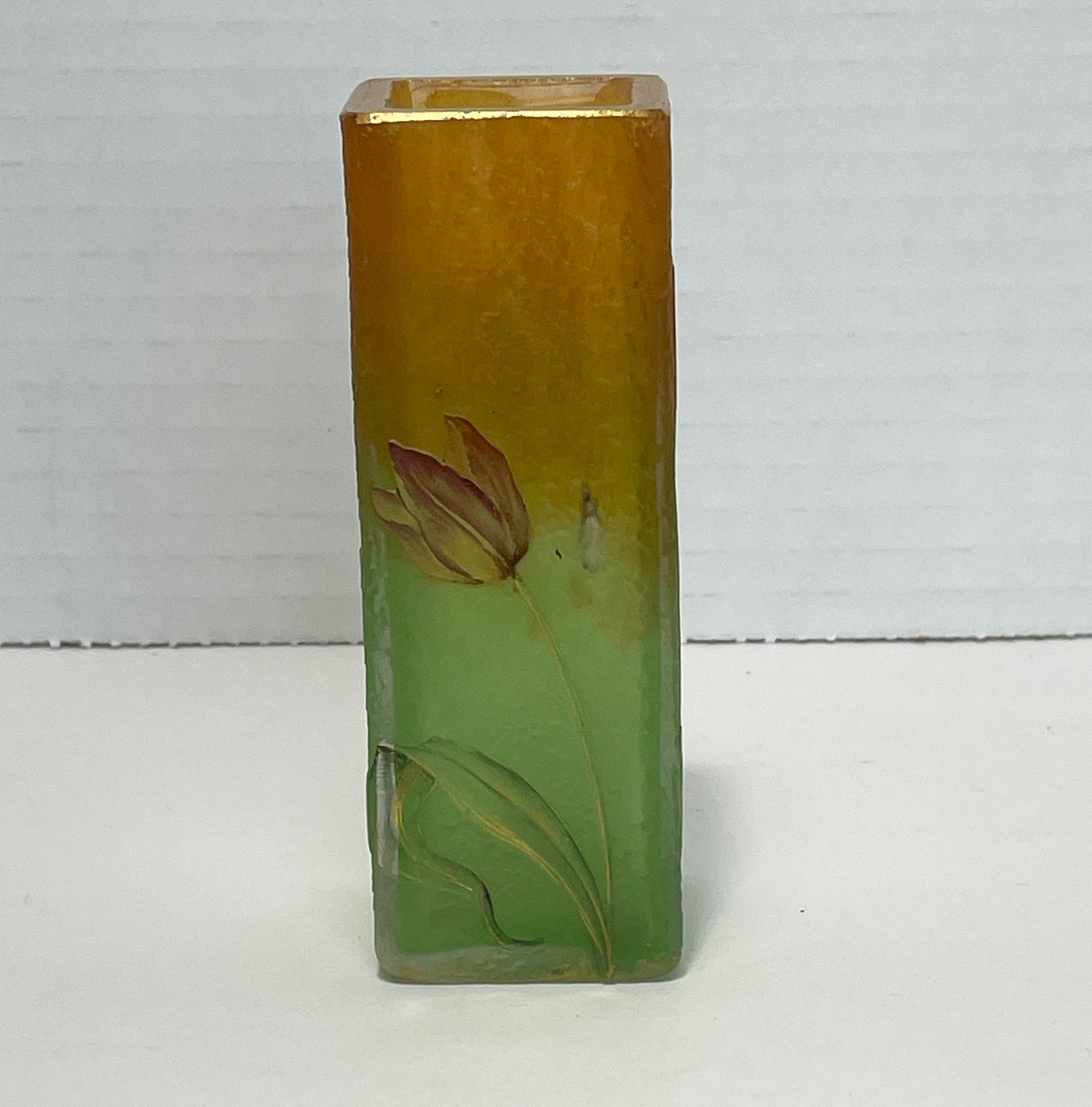 This small bud vase circa 1900 is in the Art Nouveau style. It is acid etched, carved and painted. Gold gilding is added to the flowers and to the top rim of the vase.