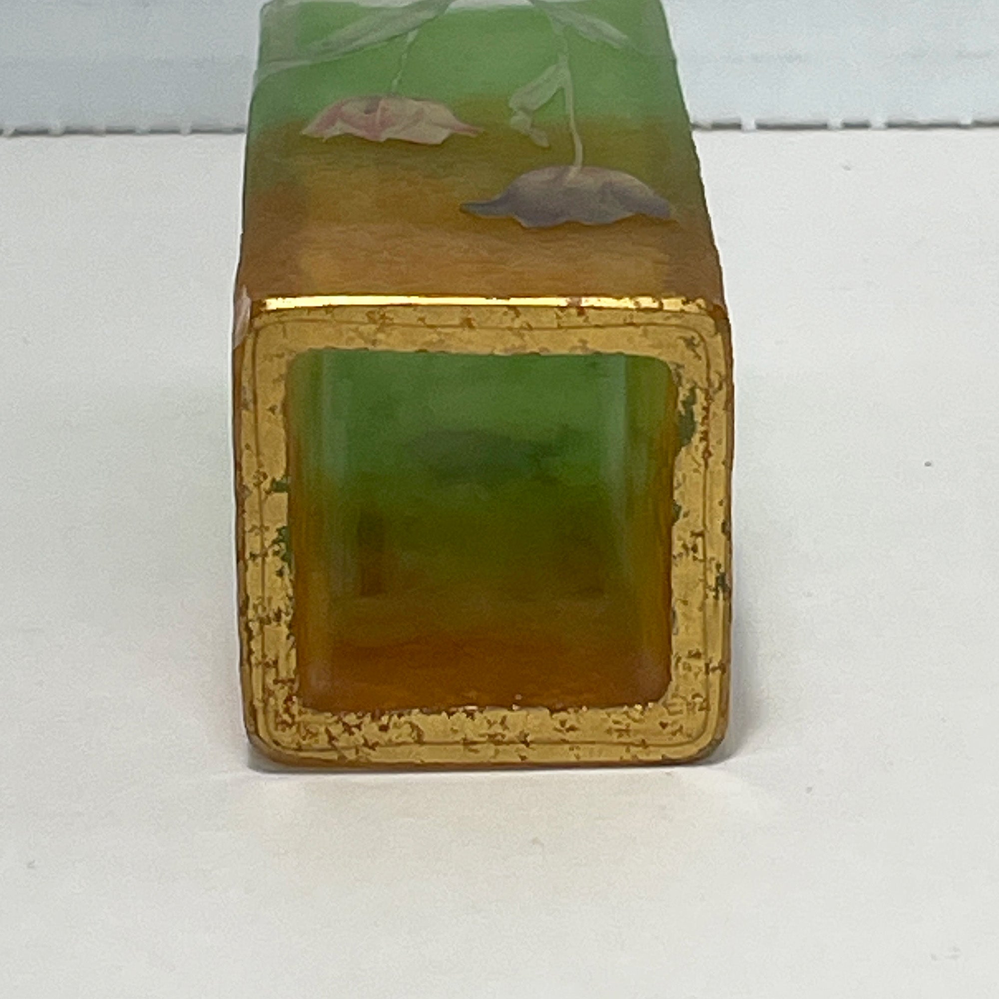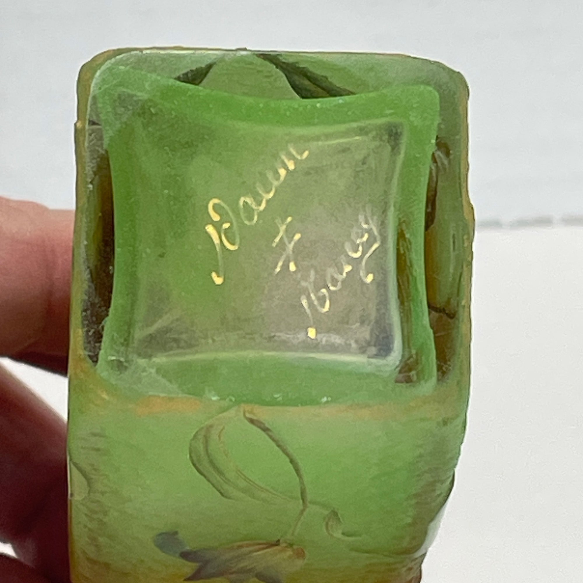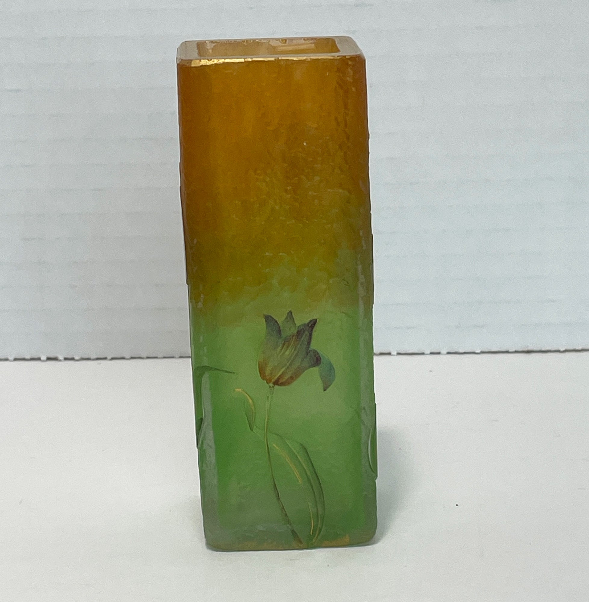 This small bud vase circa 1900 is in the Art Nouveau style. It is acid etched, carved and painted. Gold gilding is added to the flowers and to the top rim of the vase.