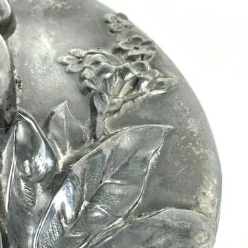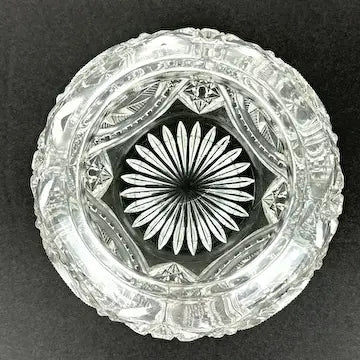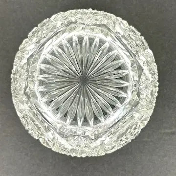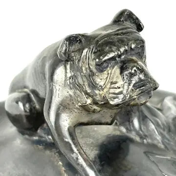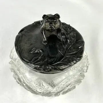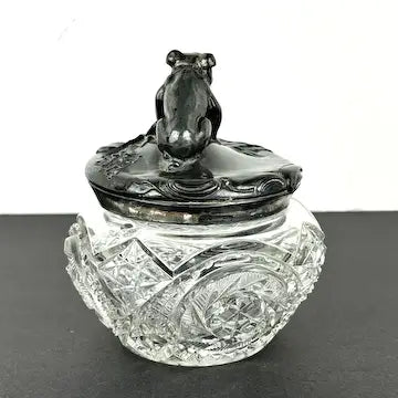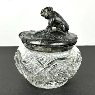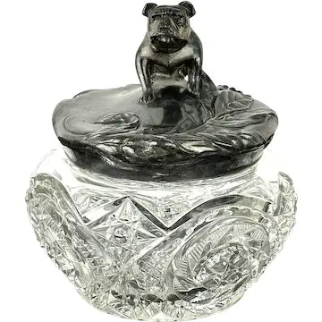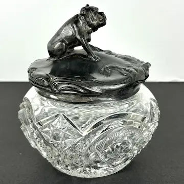 This antique silver plated cut glass humidor jar features a beautiful pinwheel pattern in crystal and a unique silver plated lid adorned with a charming bulldog sitting on a floral decor. Crafted with intricate details, this humidor jar is the perfect addition to any collection. Keep your tobacco or other special items preserved and stylish.
