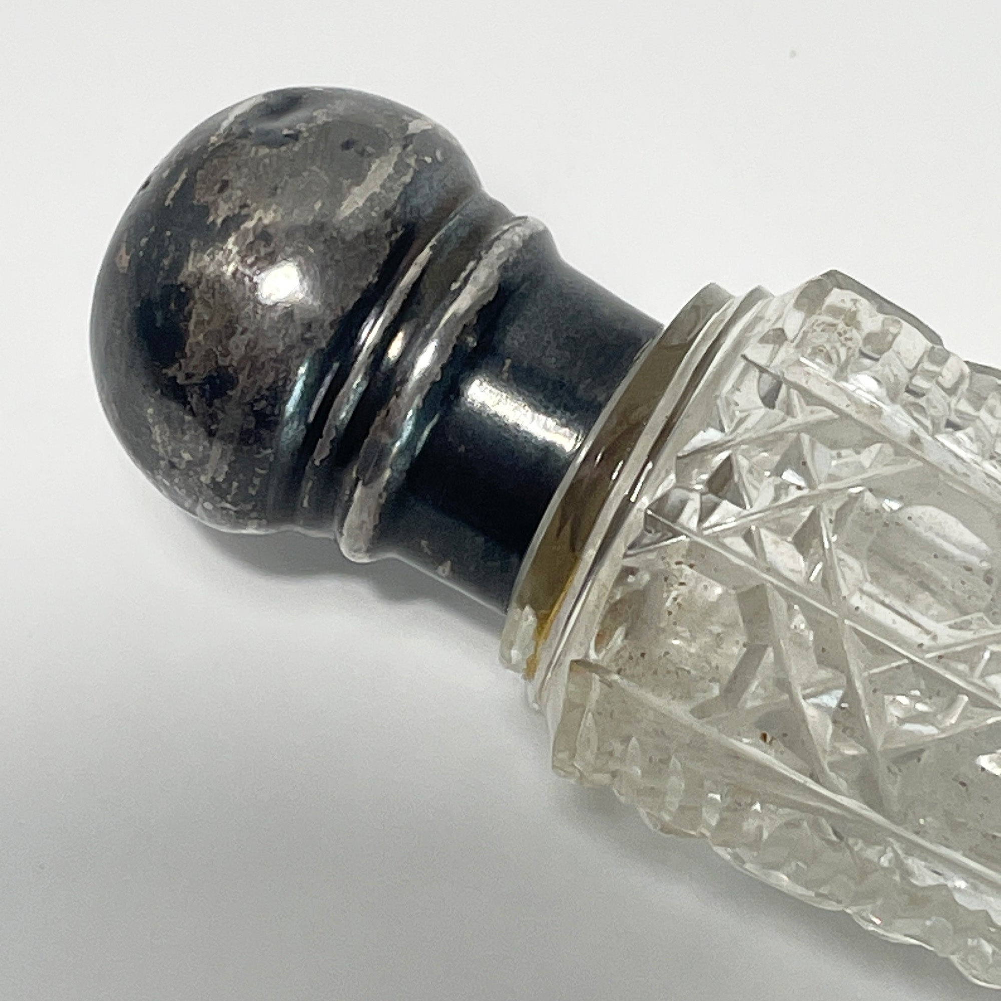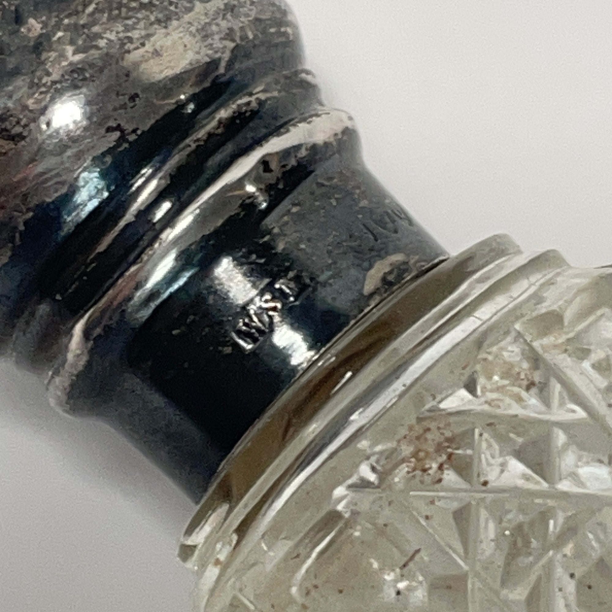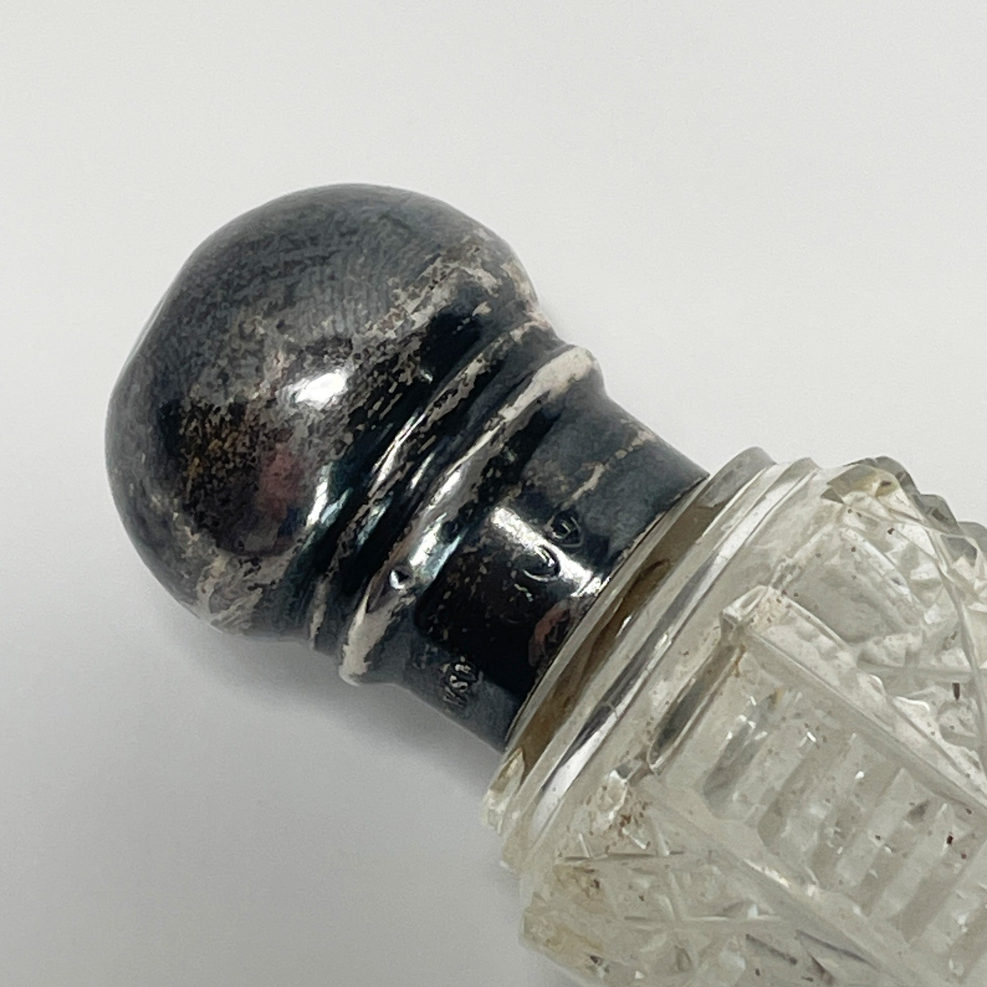 This is a beautiful cut glass perfume bottle with a silver screw top lid. It is stamped WSM with additional silver marks which are well worn but on close inspection I believe it reads: Lion Passant, Lion head in a shield shape, and Q in a shield shape indicating a silver assay date of 1891.