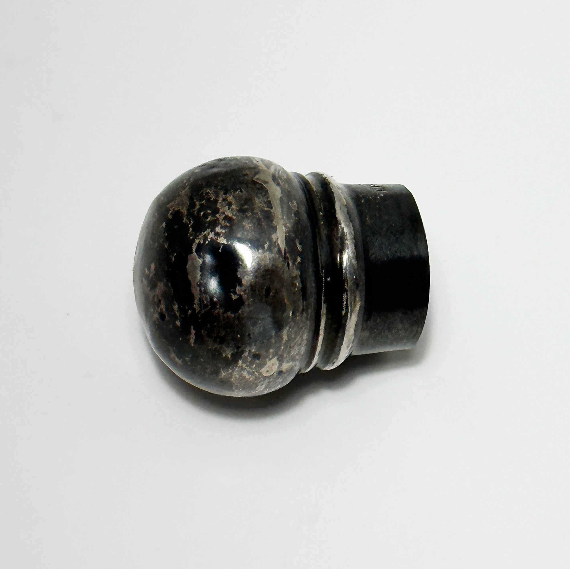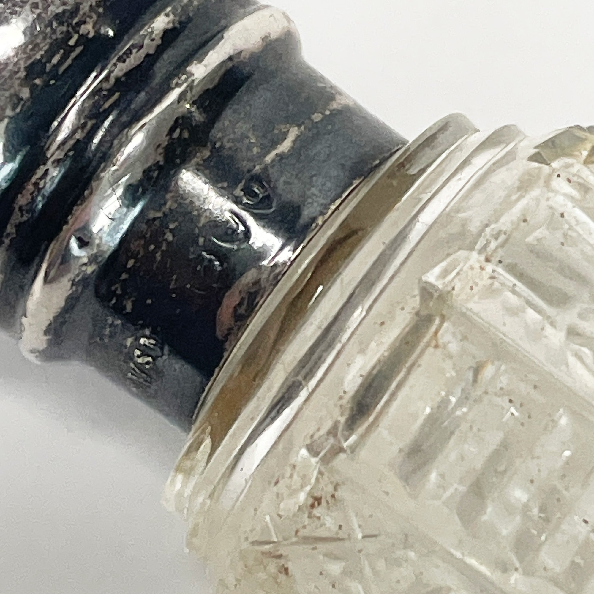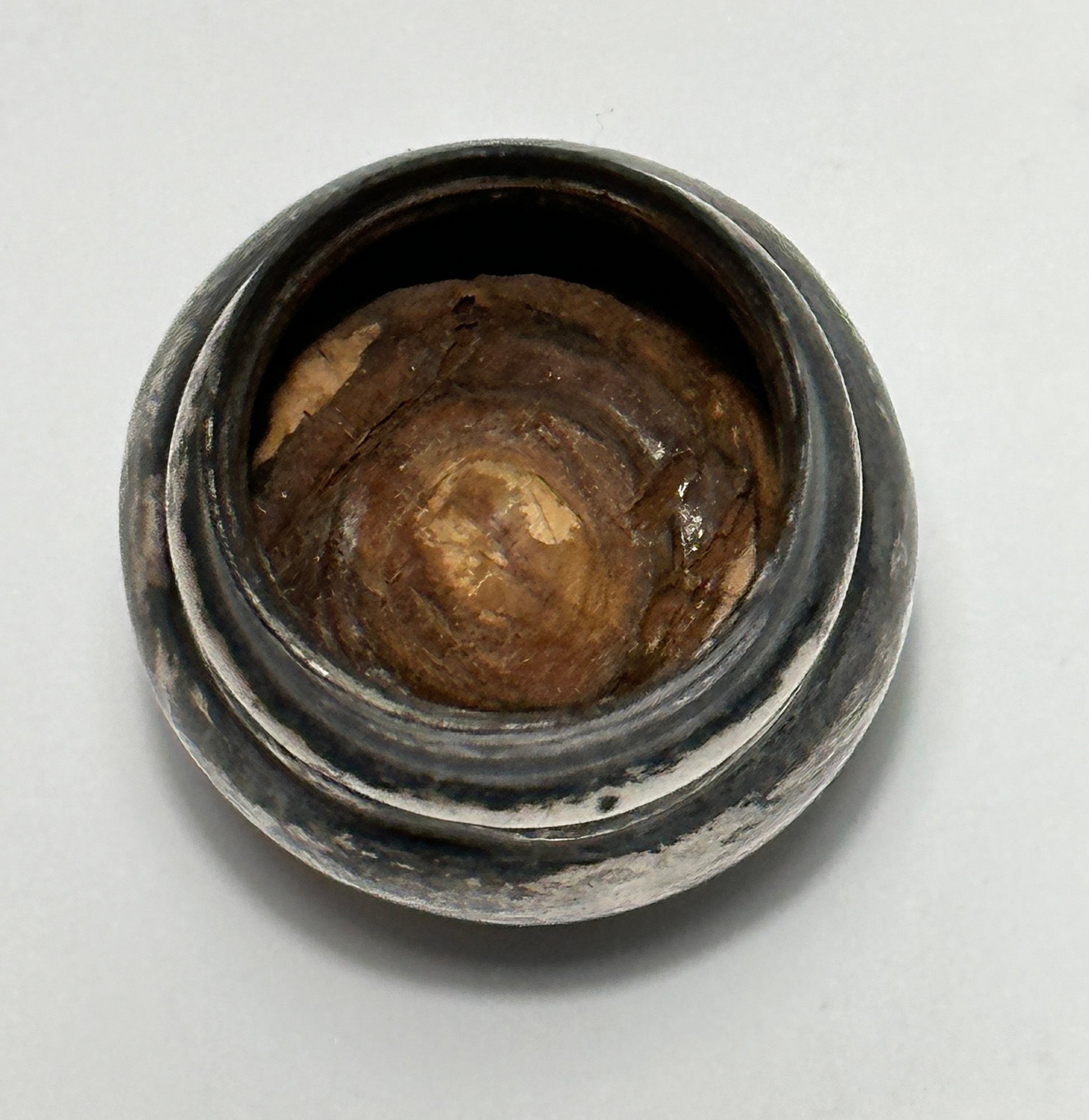 The silver cap has a nice aged patina with the cork still inside. There is a dent in the cap but it is otherwise in great condition.