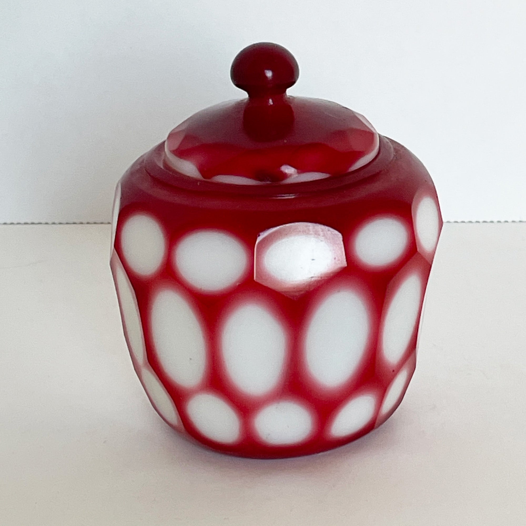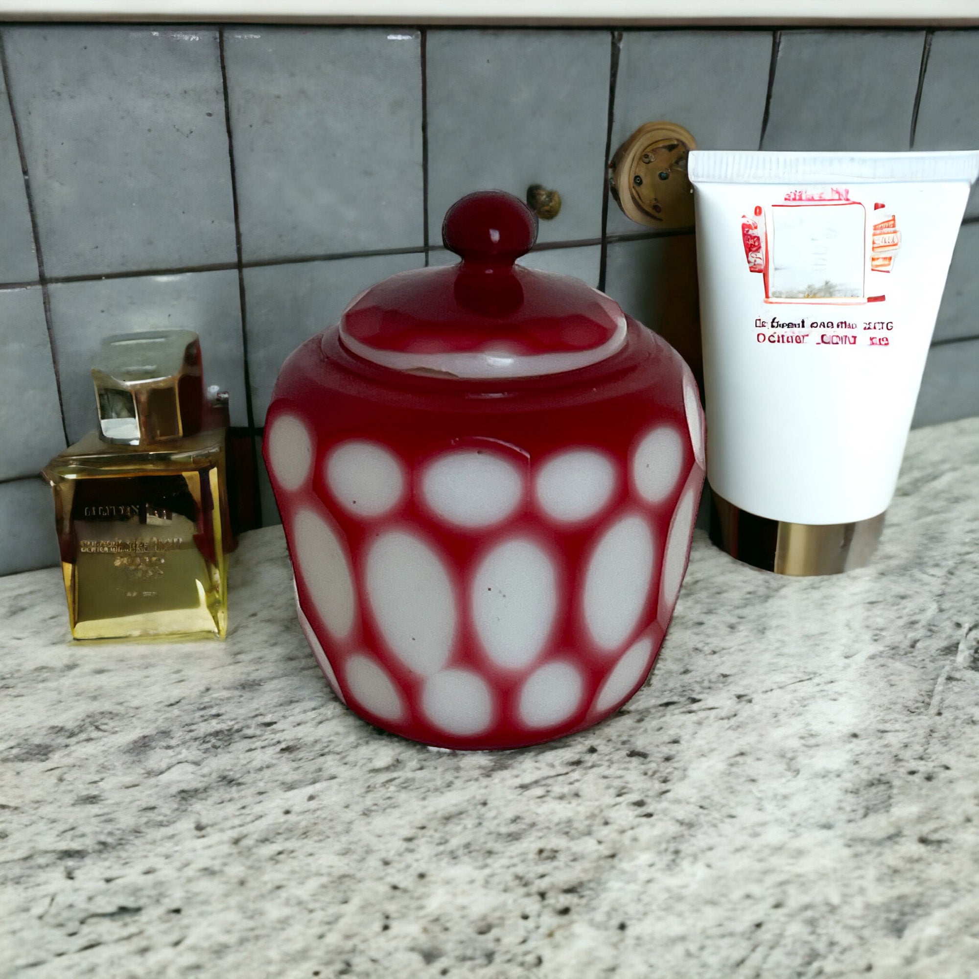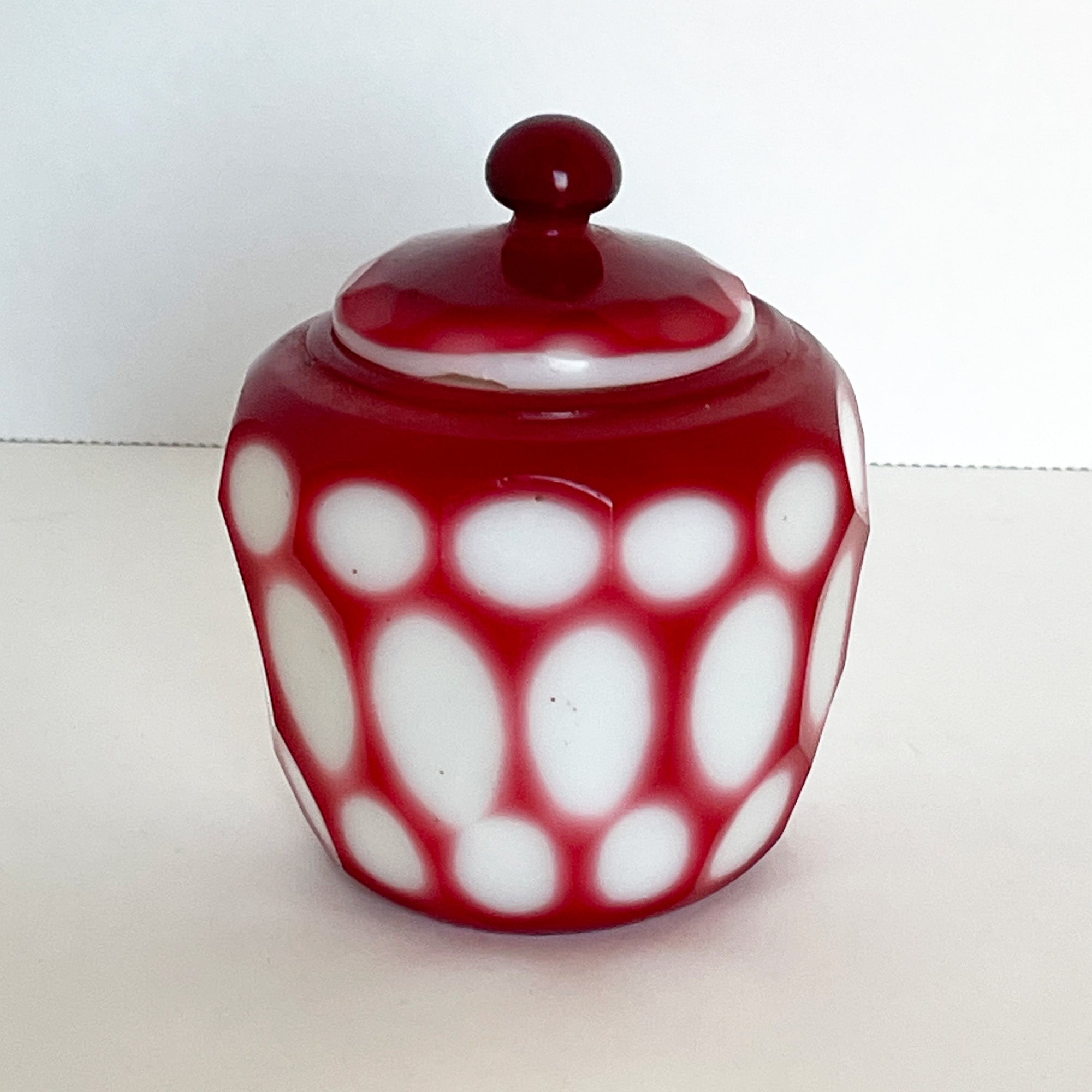 Peking glass is a process of layering different colors of glass and then cutting the glass to reveal the color underneath. The process was developed during the 18th century in Peking China. This vintage handmade trinket box uses this technique to create a faceted polka dot effect.