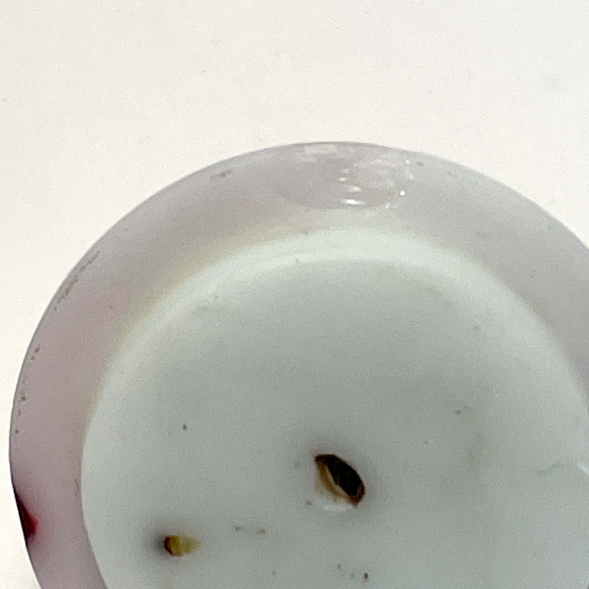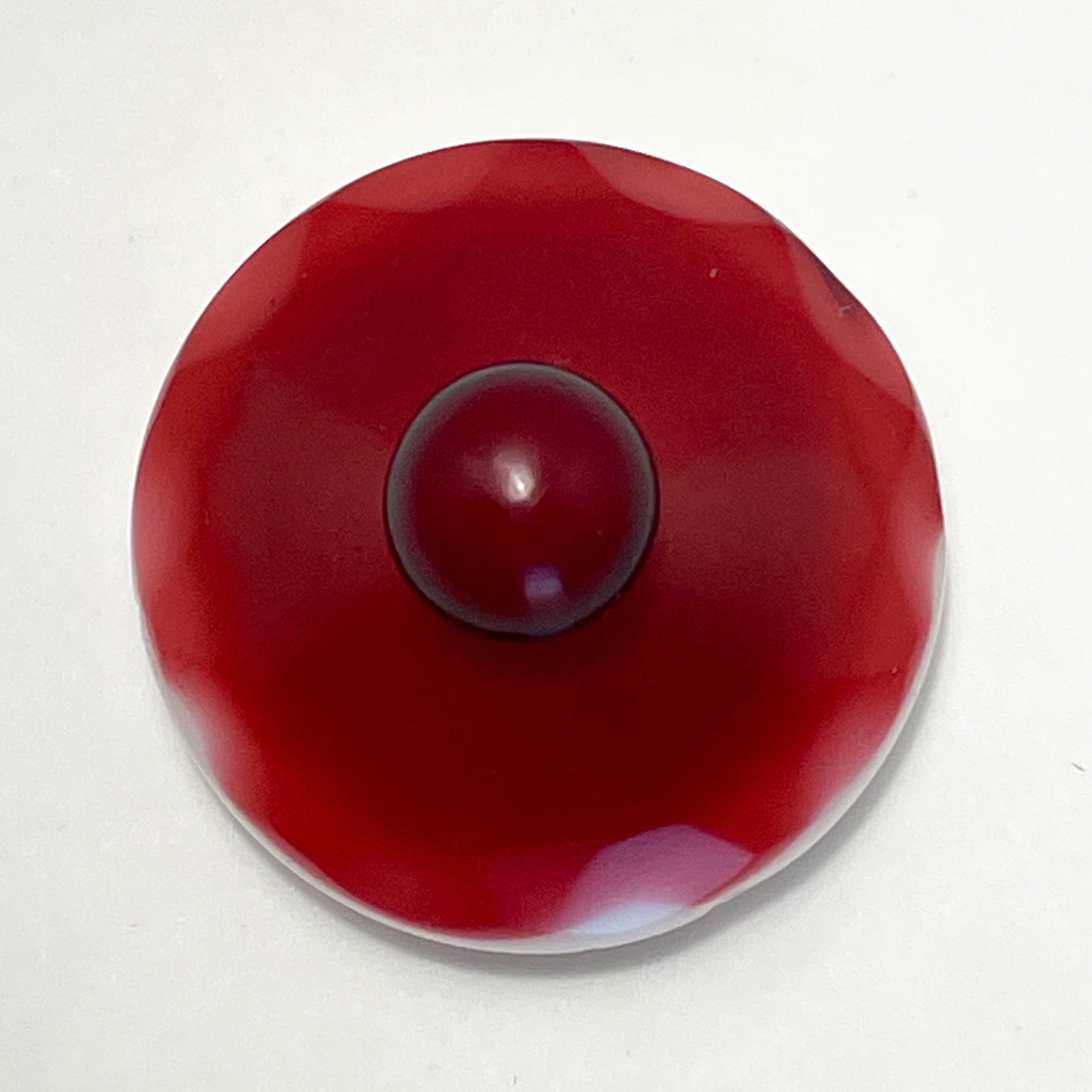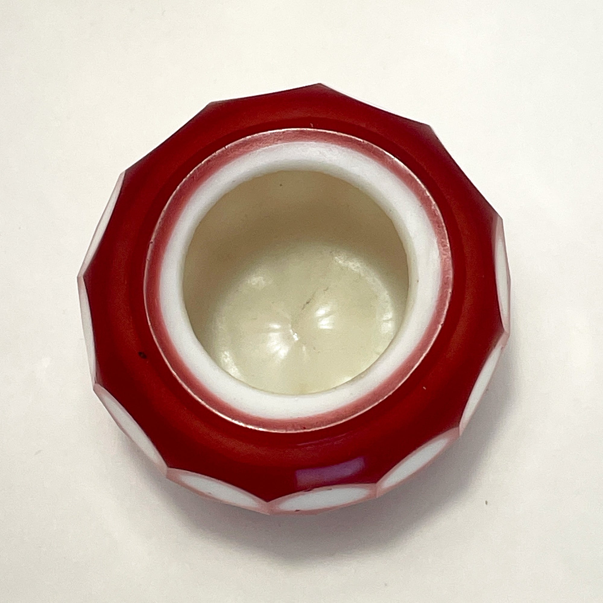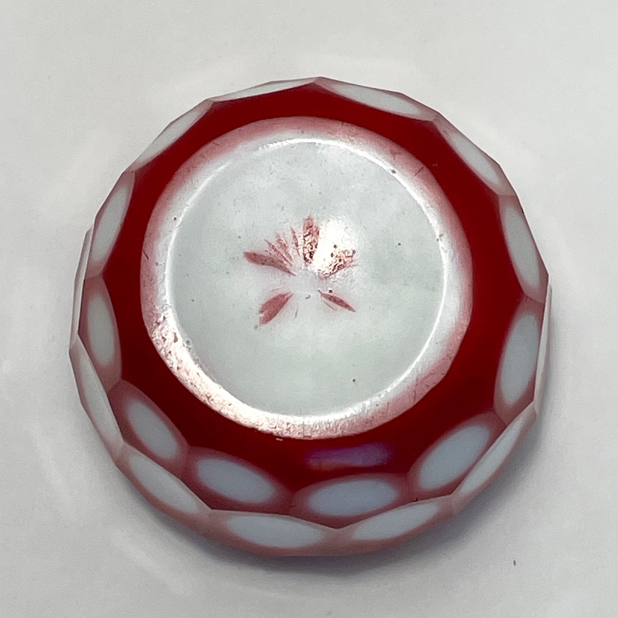 Peking glass is a process of layering different colors of glass and then cutting the glass to reveal the color underneath. The process was developed during the 18th century in Peking China. This vintage handmade trinket box uses this technique to create a faceted polka dot effect.
