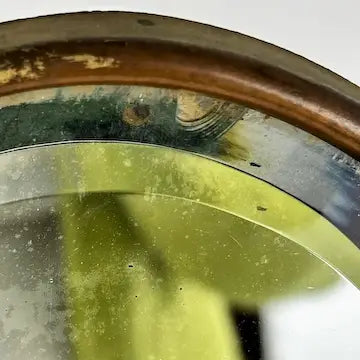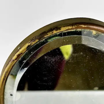 Mirror is in good condition it has several spots of desilvering on the mirror and discoloration of metal around the mirror