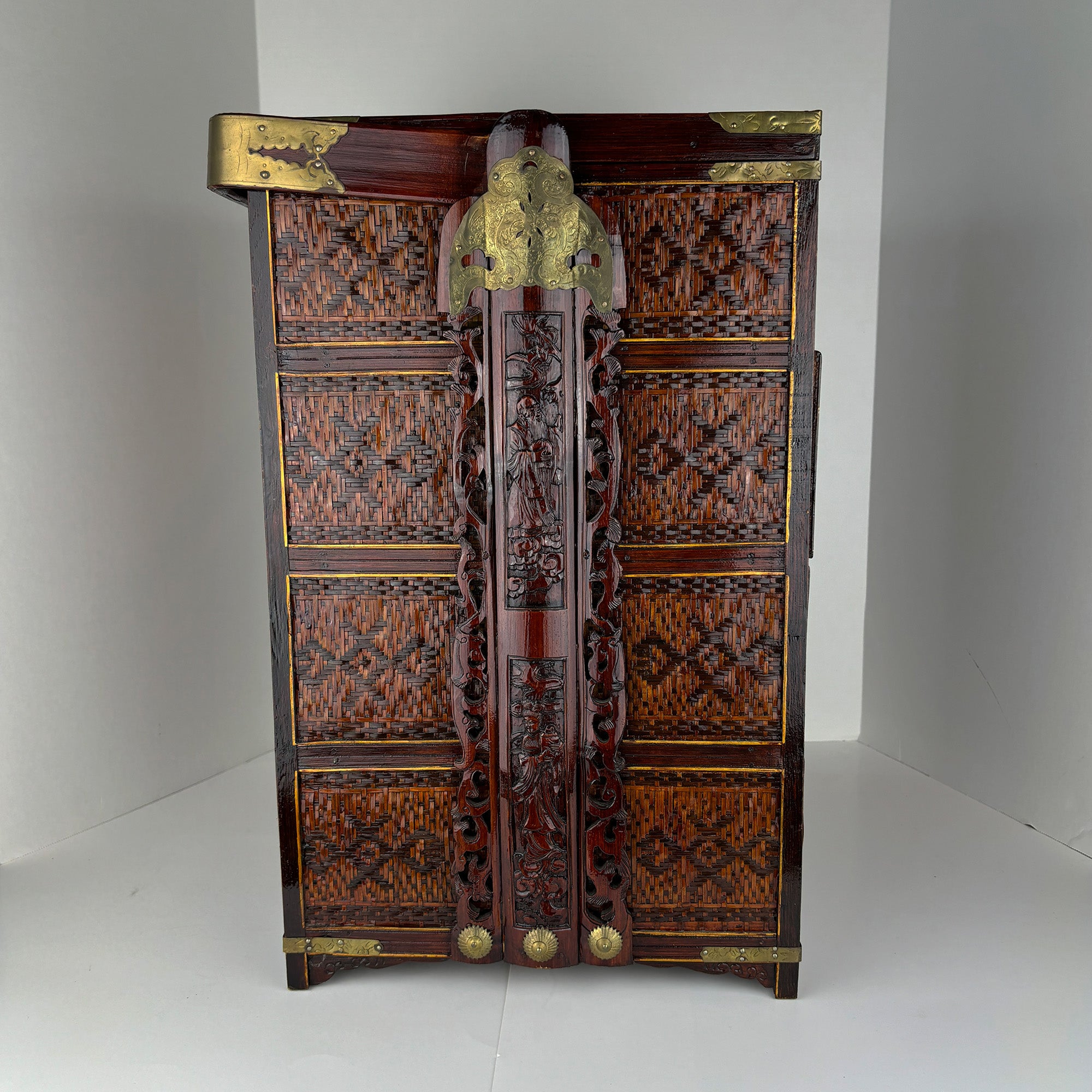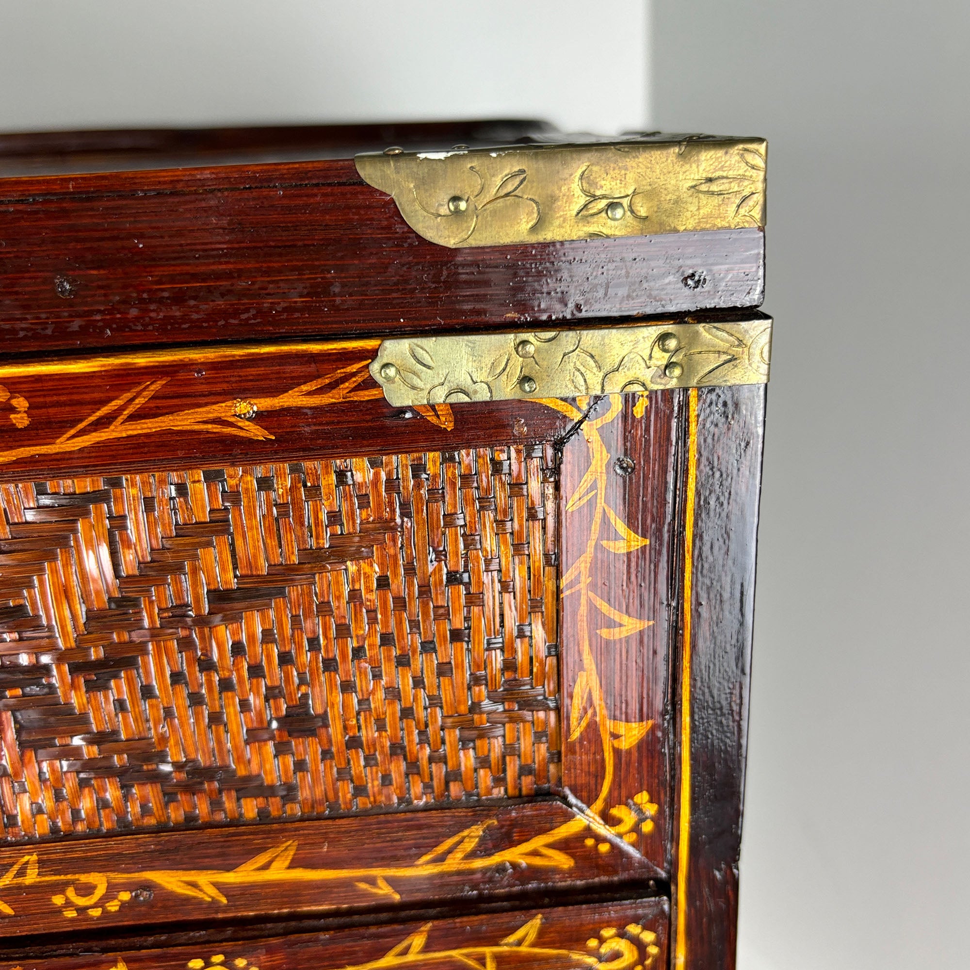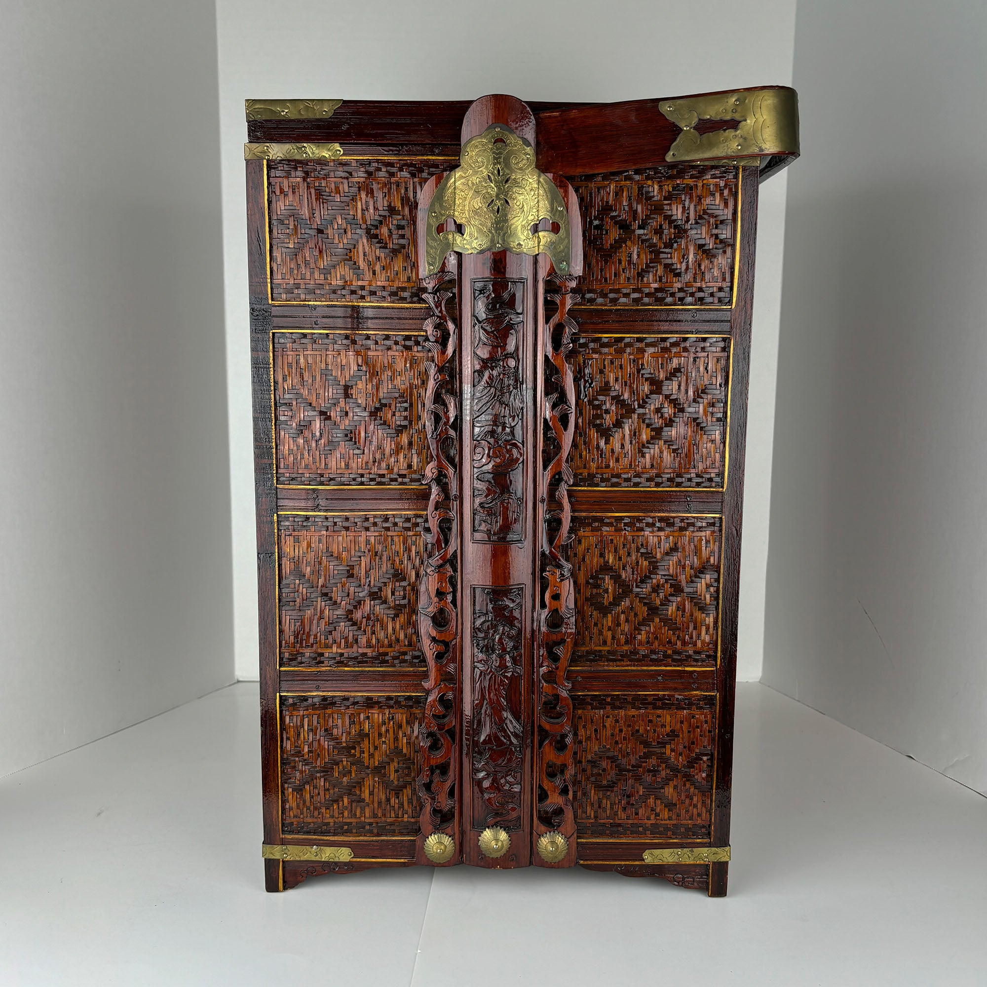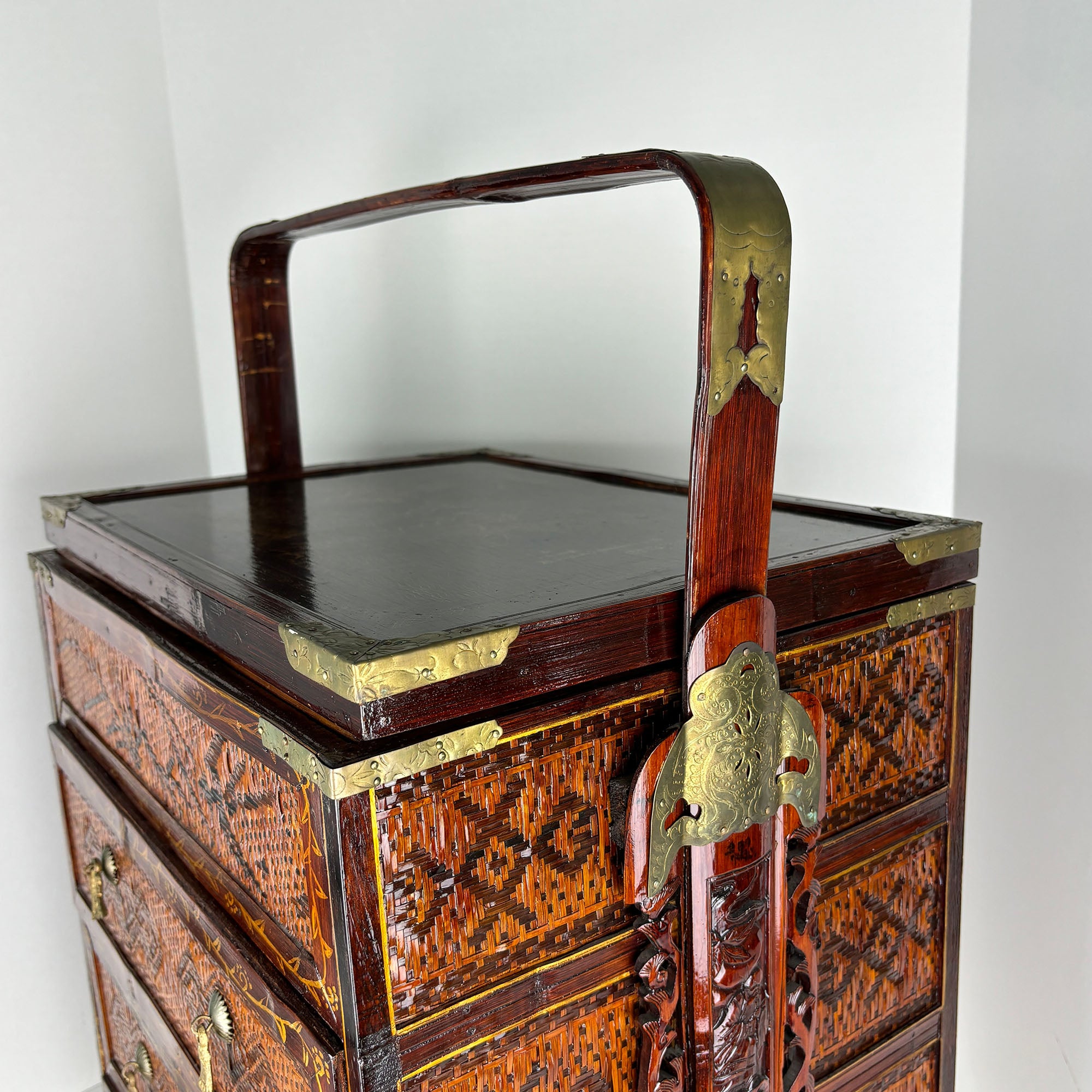 This antique Chinese wedding chest is portable and has four storage drawers. The wedding chest was typically given to the bride and groom to store food and necessities needed for the wedding day. This box is made of rattan and has a hand painted image on the top. The sides have hand carved details of Chinese figures and reinforced metal corners that are etched with intricate details.