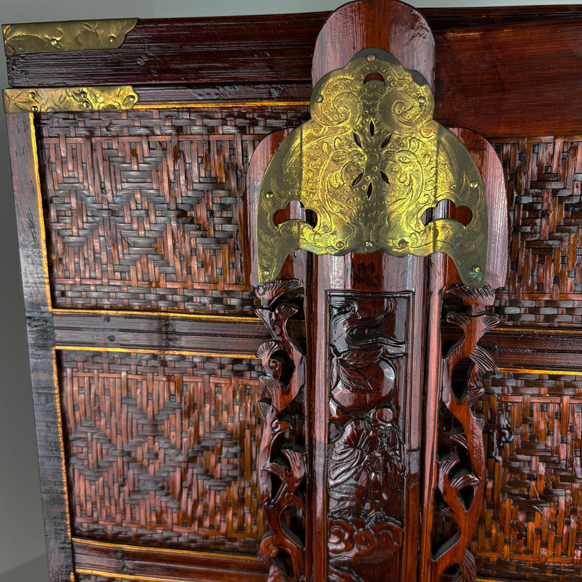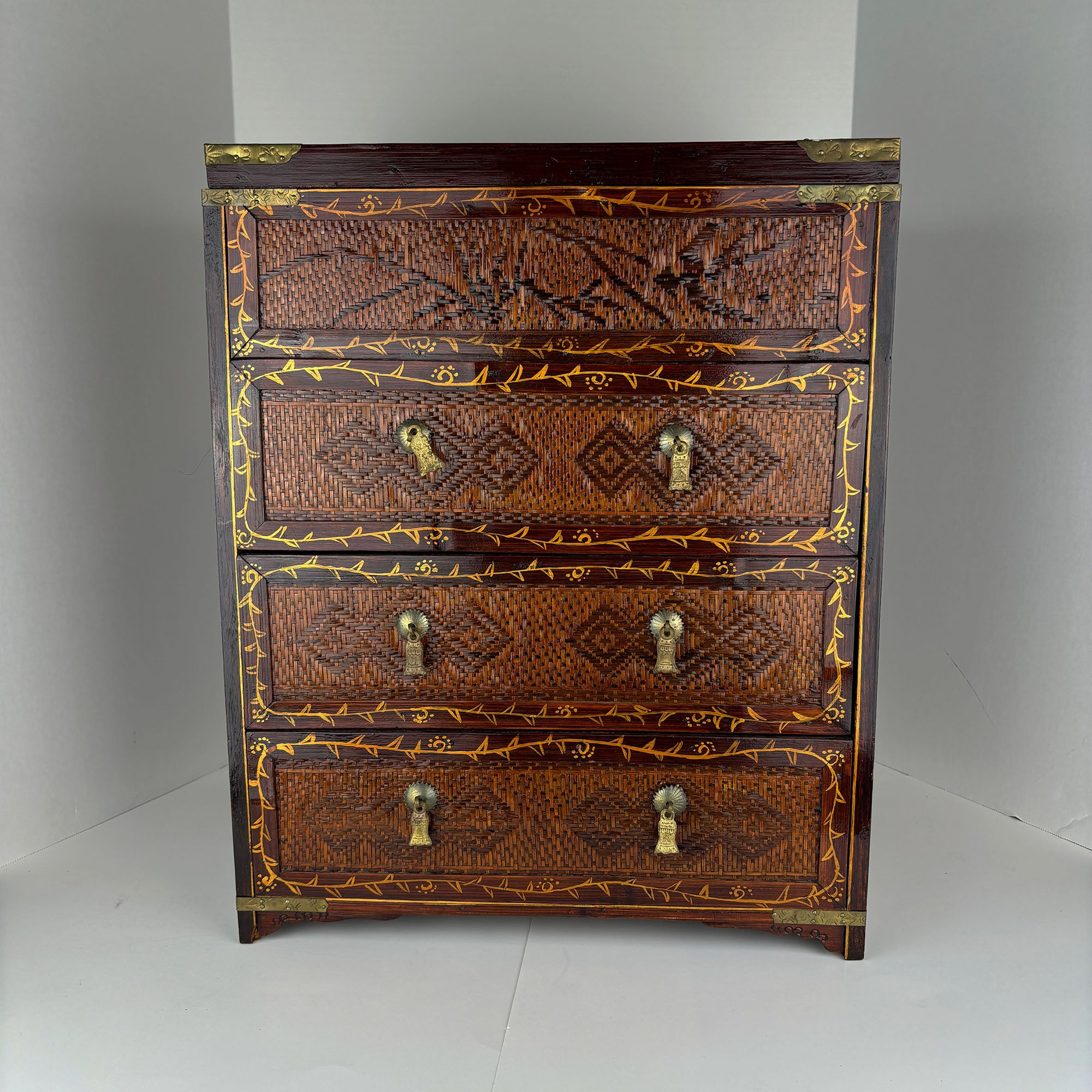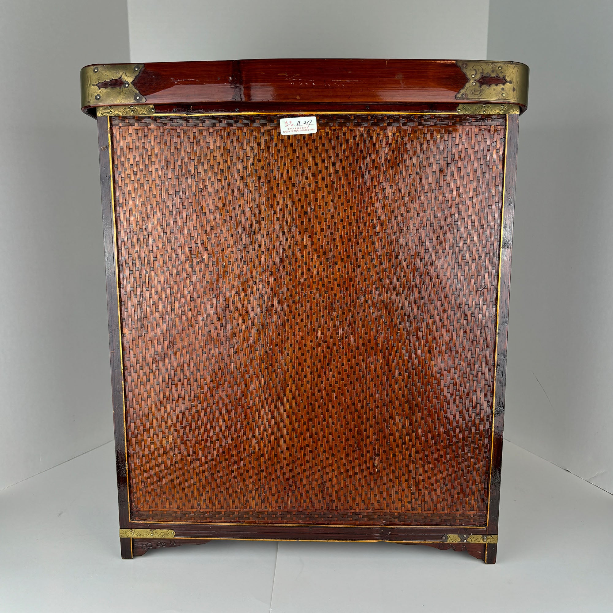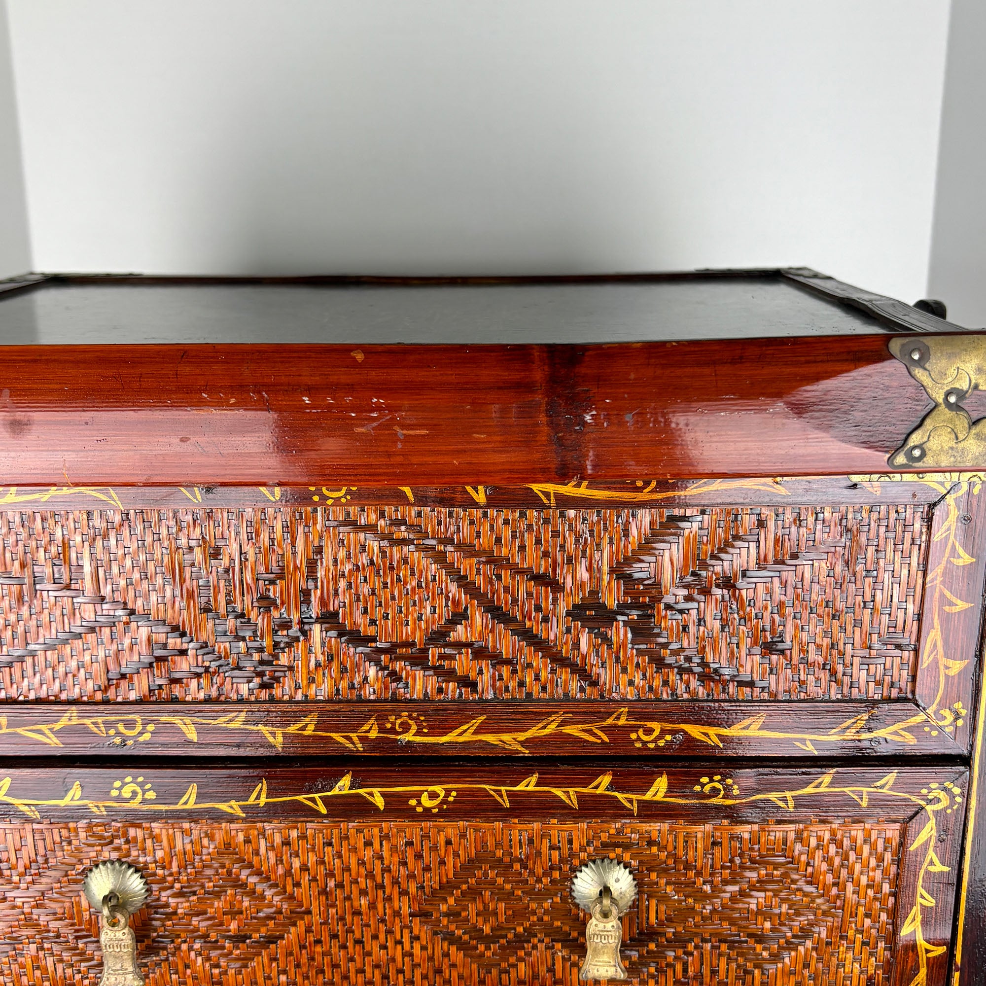This antique Chinese wedding chest is portable and has four storage drawers. The wedding chest was typically given to the bride and groom to store food and necessities needed for the wedding day. This box is made of rattan and has a hand painted image on the top. The sides have hand carved details of Chinese figures and reinforced metal corners that are etched with intricate details.
