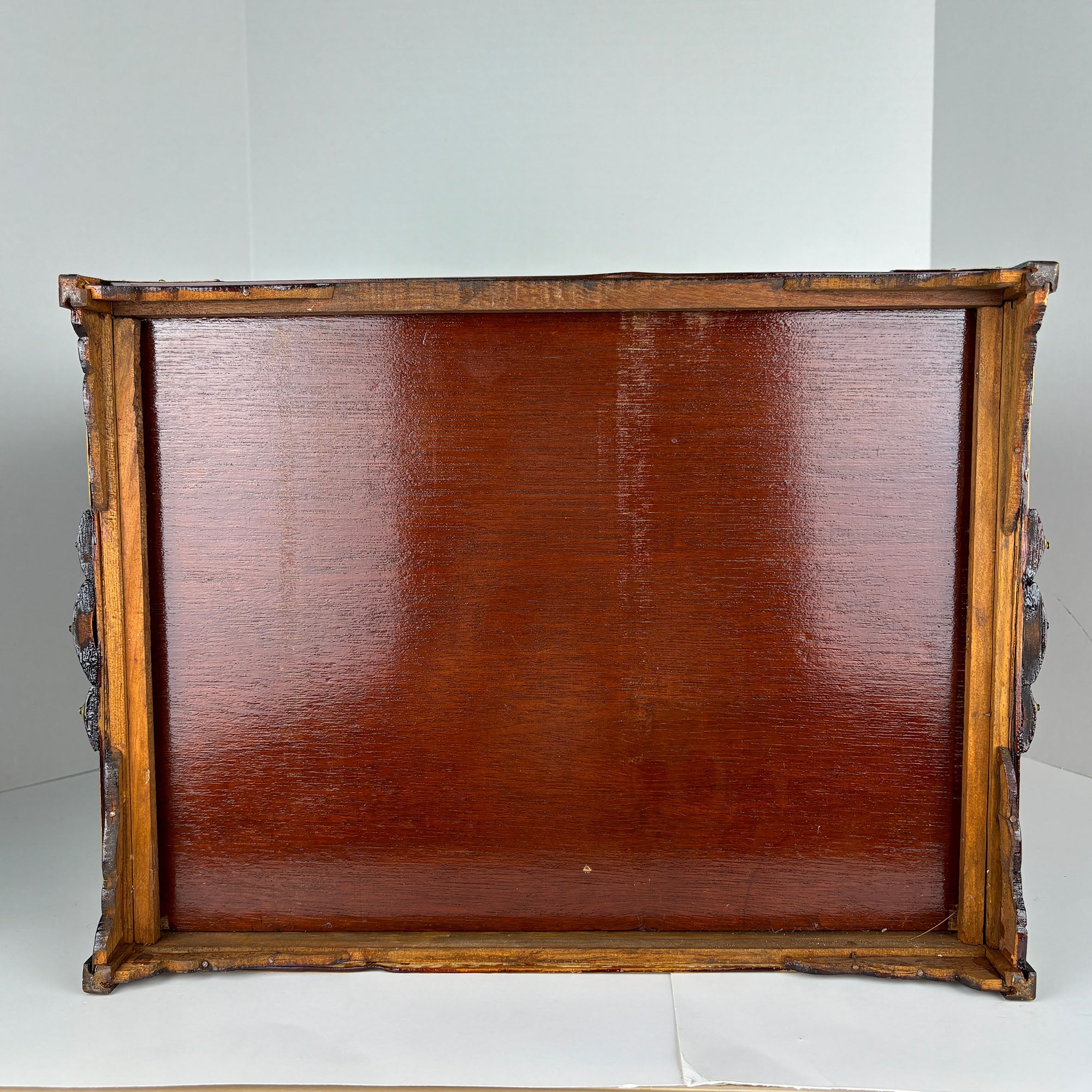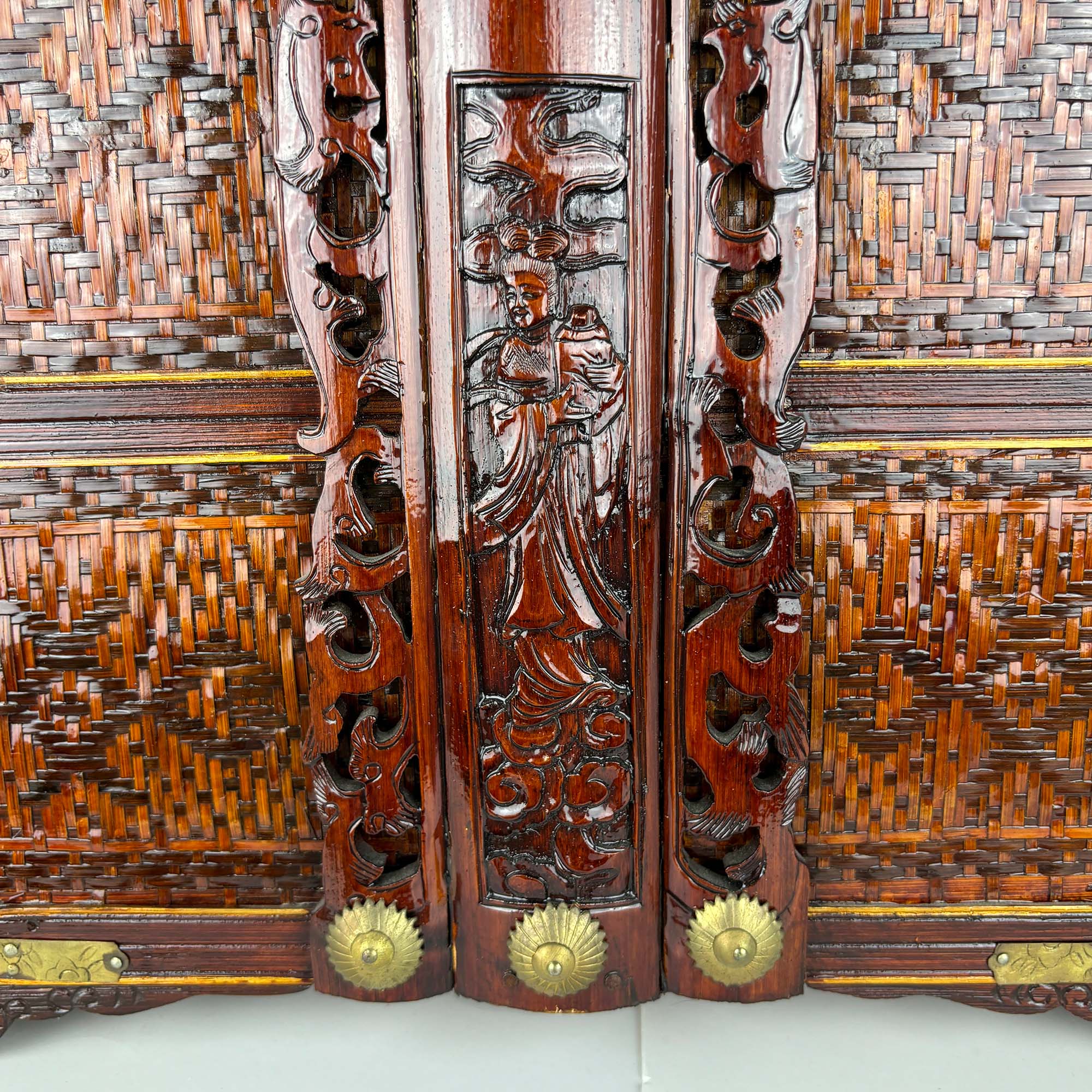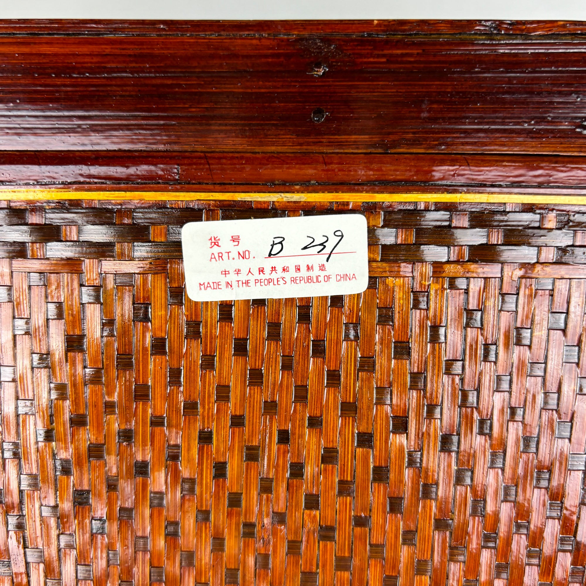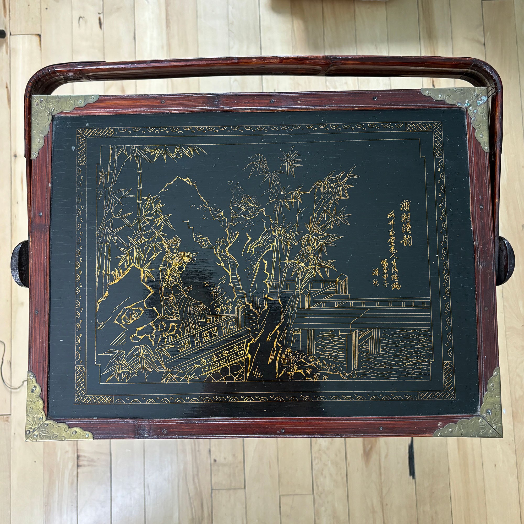 This antique Chinese wedding chest is portable and has four storage drawers. The wedding chest was typically given to the bride and groom to store food and necessities needed for the wedding day. This box is made of rattan and has a hand painted image on the top. The sides have hand carved details of Chinese figures and reinforced metal corners that are etched with intricate details.