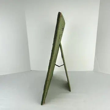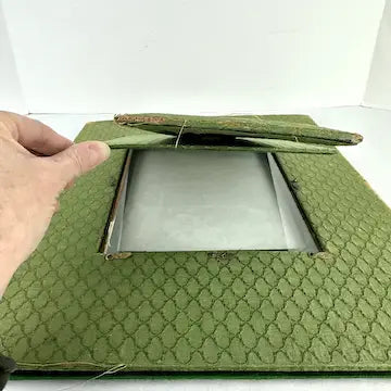 It retains the original hand rolled glass photo cover. The back of the frame has a door that is hinged on top and lifts up to install a photo as shown. The metal brackets around it swivel to lock the door in place. The back is fitted with an easel stand for tabletop display. It also has a metal loop at the top so it can be wall mounted.