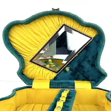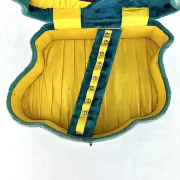 This antique Victorian French green velvet sewing box features a luxurious, yellow velvet and ruched silk lining accented by delicate celluloid flowers. Perfect for storing all your sewing essentials, it adds a touch of timeless elegance to any craft room or sewing space.
