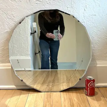 Experience midcentury style with the Hagemann midcentury etched starburst mirror 24". This stunning mirror features an etched starburst and rocket design, created with the expert craftsmanship of Hagemann's model 179. The beveled edge and wall mounted design add both functionality and elegance to any room. Elevate your home with this round mirror today.