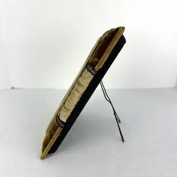 This antique picture frame is a beautiful and functional addition to any home decor. Made with antique Victorian-era design, this frame features a luxurious wood covered in velvet and ruched silk. Its classic rectangle shape and freestanding design make it an elegant and versatile choice for displaying your favorite photos.