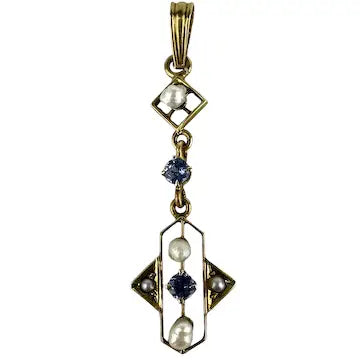 Art Deco 14k Gold Blue Topaz and Pearl Lavalier Pendant