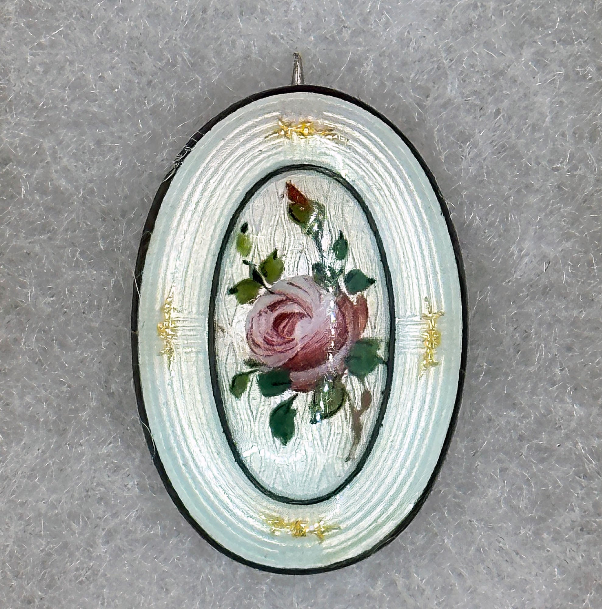 Norwegian antique enameled brooch by Aksel Holmsen. This pin is beautifully painted with intricate enameling details which is especially astounding for its small size. It has the old style soldered pin and C clasp.