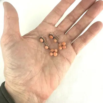 Crafted in the early 20th century, these Antique Natural Coral Drop Earrings feature stunning, natural coral beads. The salmon colored stones are delicately set in a gold over sterling silver setting, making them a gorgeous addition to any jewelry collection. These earrings provide a touch of vintage elegance to any outfit.