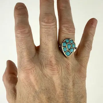 The set is otherwise in great antique condition. The emeralds sparkle beautifully. The turquoise is a beautiful sky blue. The pearls retain their luster. The ear wires and ring swivel easily.
