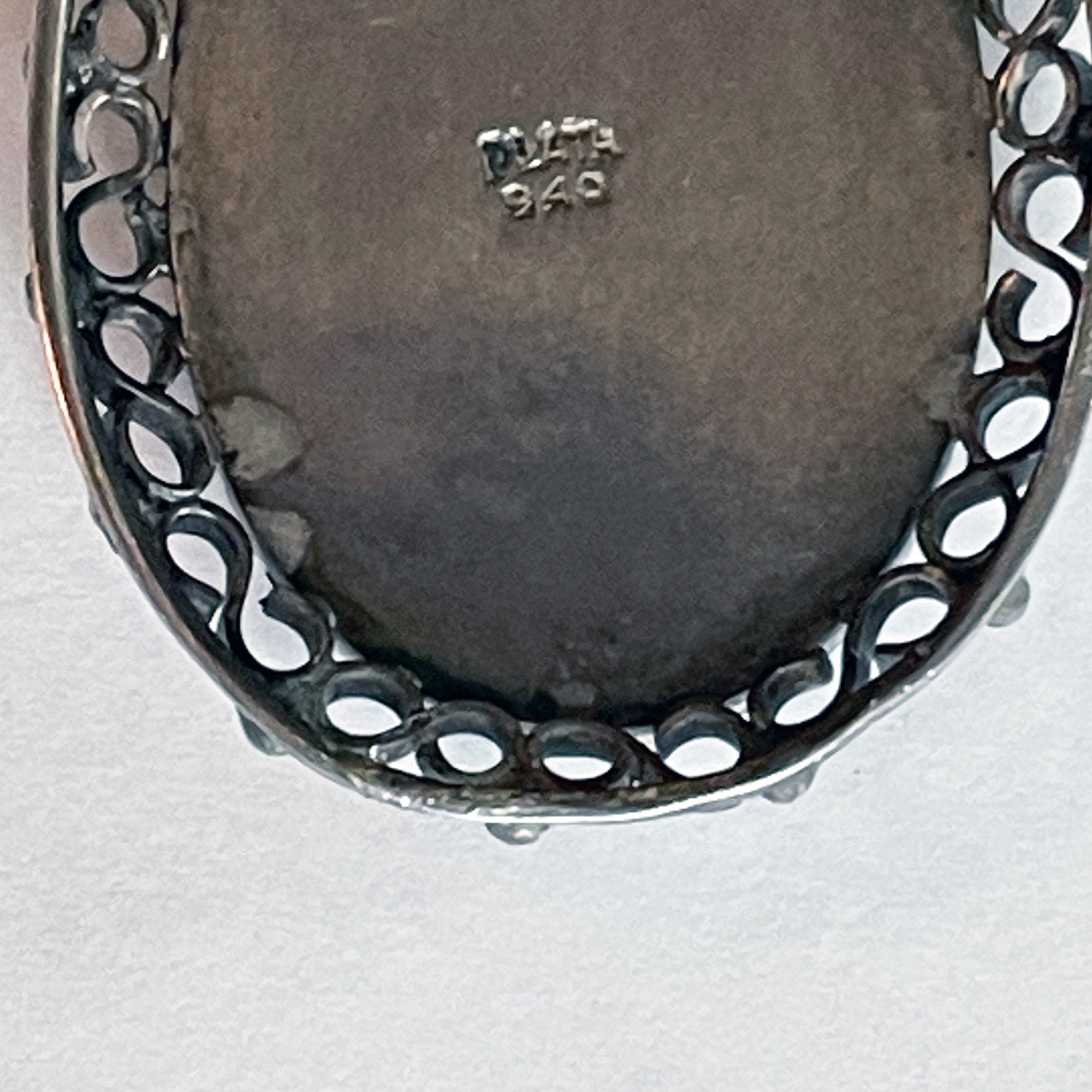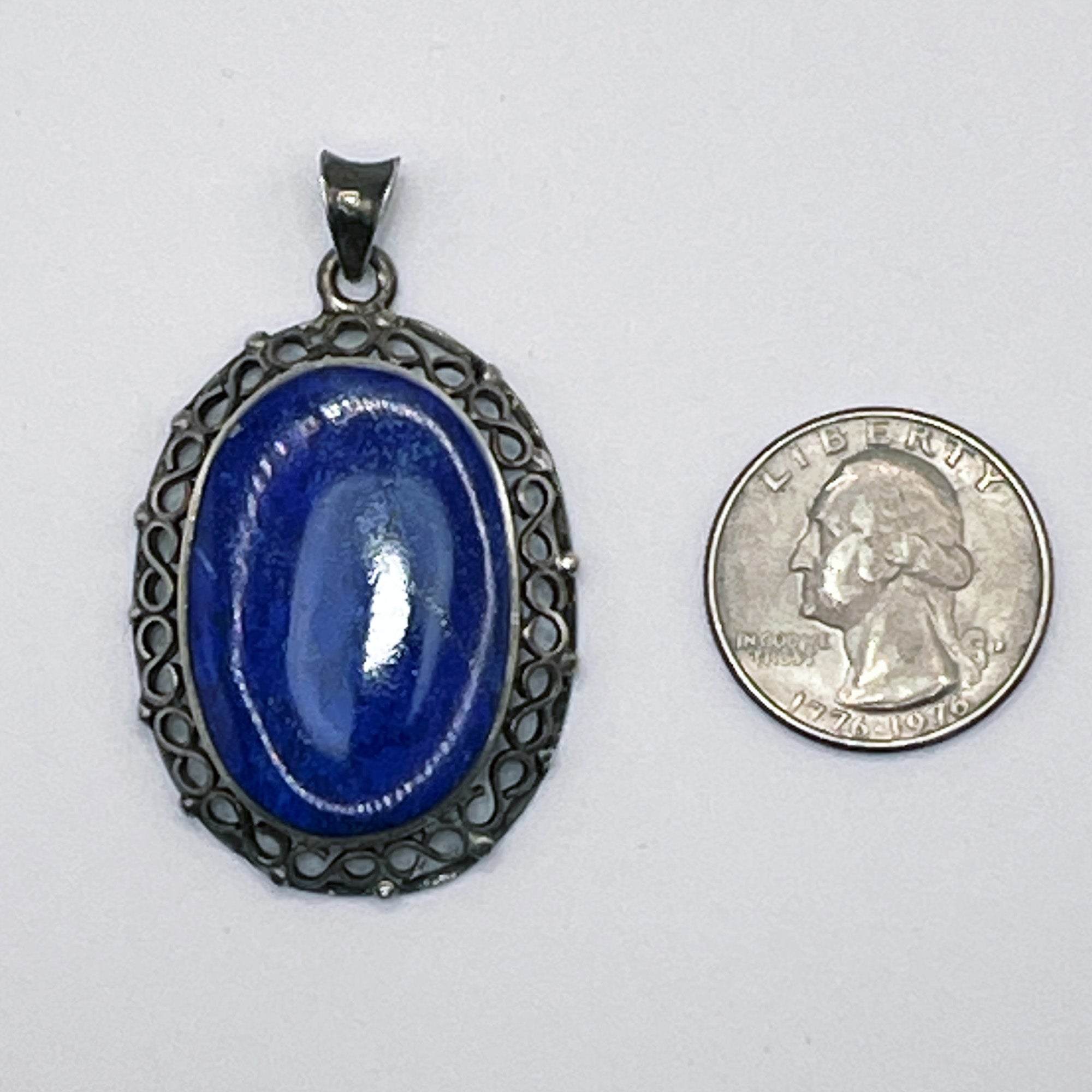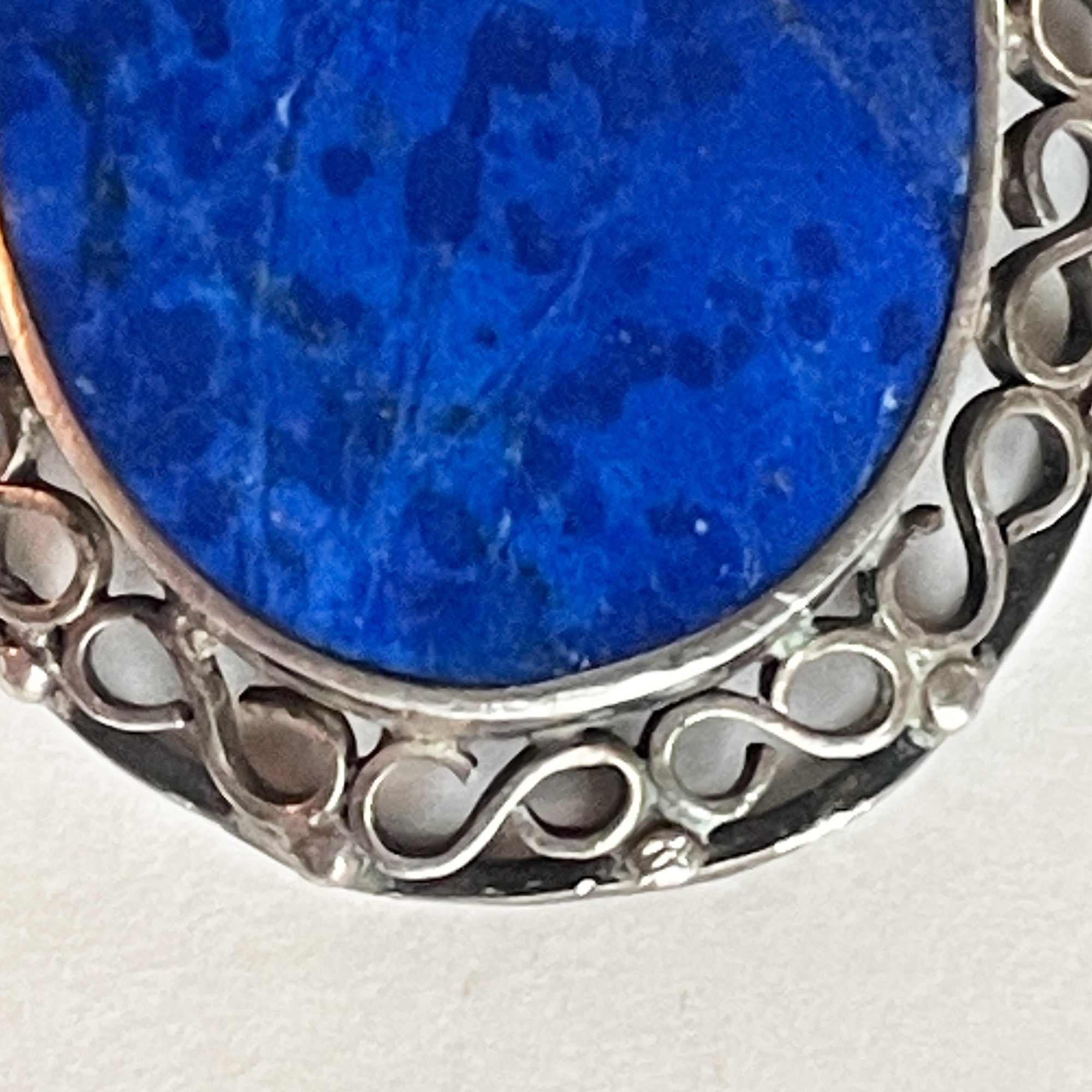 This beautiful lapis pendant is bezel set and surrounded by ornamental silver work. It is stamped with the Mexican silver mark “Plata 940” (or 940 silver).